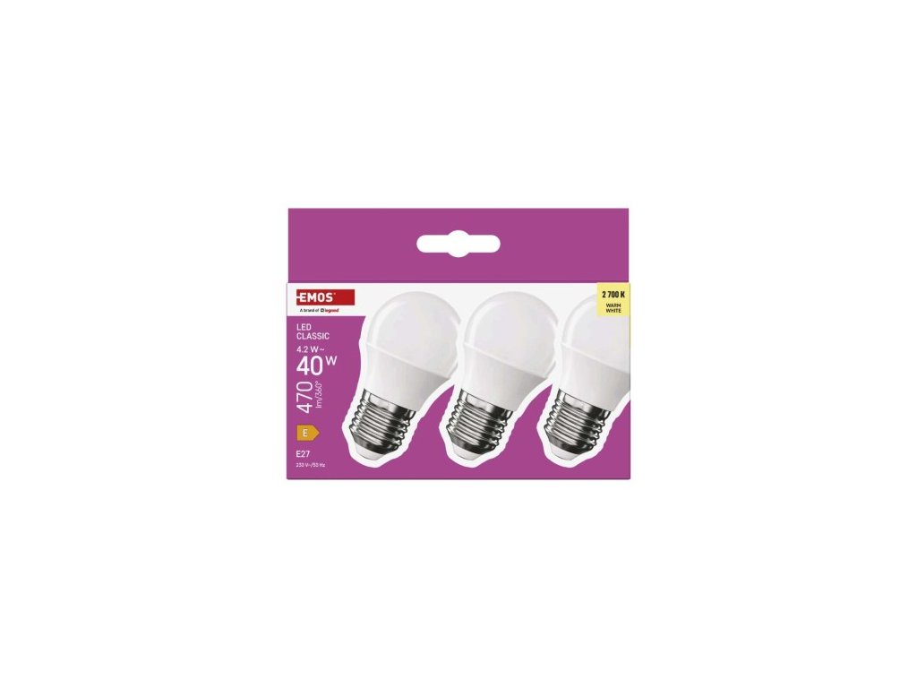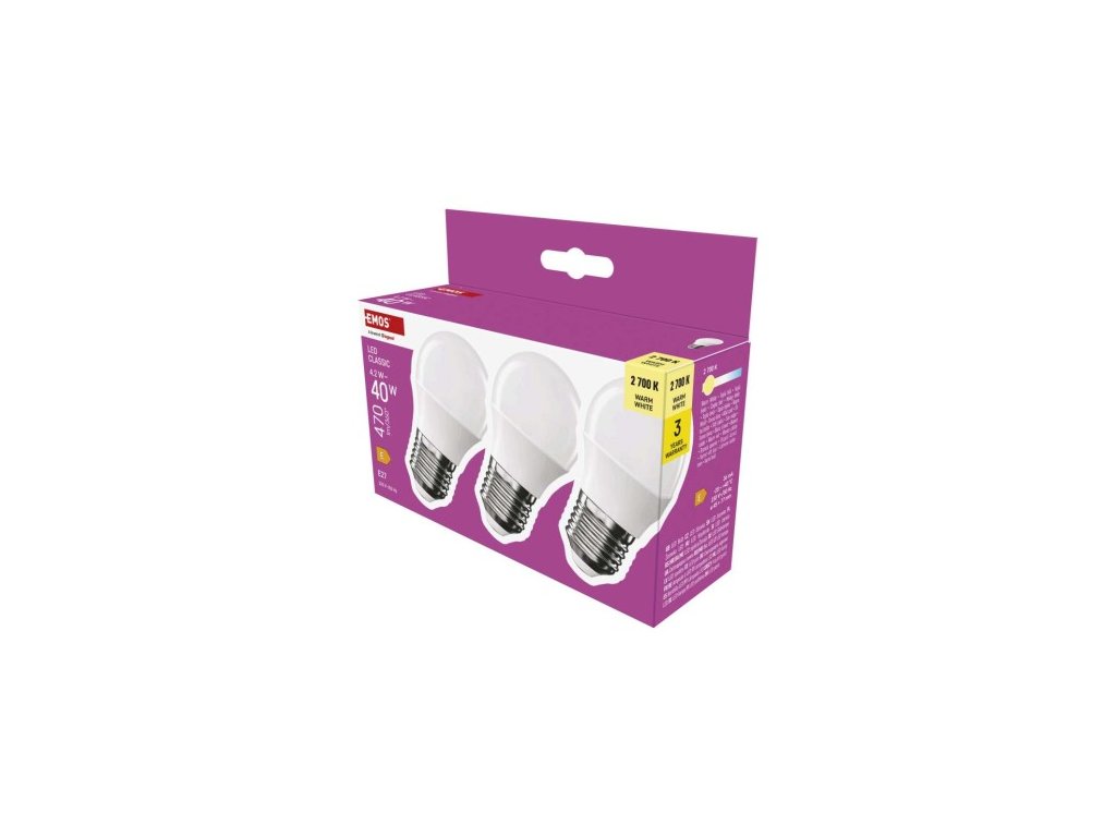 farba svetla: teplá biela|energetická trieda: E|index podania farieb (CRI): 80|kompatibilita: –|náhrada za žiarovku: 40 W|napätie: 230 V~/50 Hz|notifikácia do mobilnej aplikácie: ne|ovládanie hlasovými asistentmi: ne|pätica (uchytenie žiarovky): E2 cyklov: 30 000|podporované OS: –|prenosová frekvencia: –|príkon: 4,2 W|predajný obal: 3 ks, krabička|protokol: –|rad: CLASSIC|rozmer: 45 × 45 × 77 mm|stmievateľná: ne|svetelná: ne|svetelná 470 lm|technológia: LED|teplota chromatickosti: 2 700 K|tvar: Mini Globe|typ čipov: SMD|účinník: 0,50|uhol vyžarovania: 150°|záručná doba: 3 roky|životnosť: 30 000 hodínDodatočné parametre