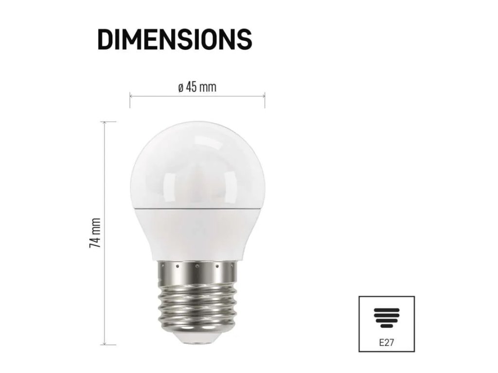 farba svetla: neutrálna biela|energetická trieda: F|index podania farieb (CRI): 80|kompatibilita: –|náhrada za žiarovku: 40 W|napätie: 230 V~/50 Hz|notifikácia do mobilnej aplikácie: –|ovládanie hlasovými asistentmi: –|pätica (uchytenie žiarovky):| cyklov: 25 000|podporované OS: –|prenosová frekvencia: –|príkon: 5 W|predajný obal: 1 ks, krabička|protokol: –|rad: CLASSIC|rozmer: 74 × 45 × 45 mm/stmievateľná: ne|svetelná účinnosť: ne|svetelná účinnosť lm|technológia: LED|teplota chromatickosti: 4 000 K|tvar: Mini Globe|typ čipov: SMD|účnik: 0,53|uhol vyžarovania: 220°|záručná doba: 3 roky|životnosť: 30 000 hodínDodatočné parametre