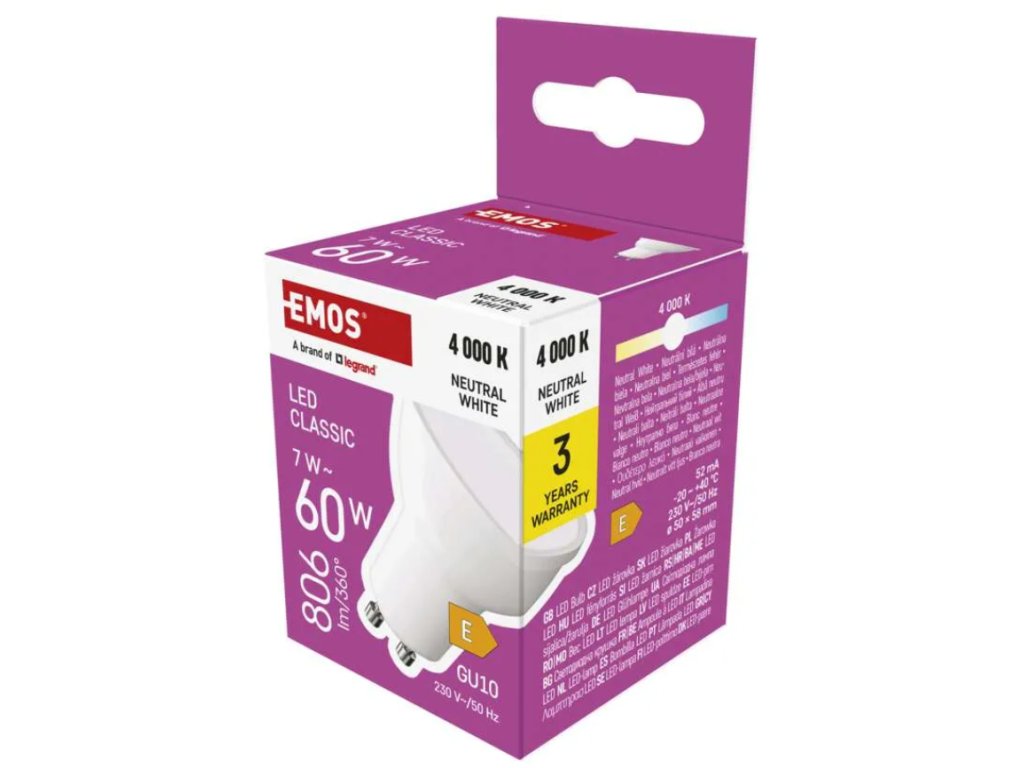 LED žiarovka s päticou GU10 s výkonom 7 W, 800 lúmen (náhrada za žiarovku 60W). Farba svetla neutrálna biela 4000 Kelvin, 30 000 hod. svietivosti, uhol svietivosti 110 °. Svetelný zdroj nie je stmievateľný.