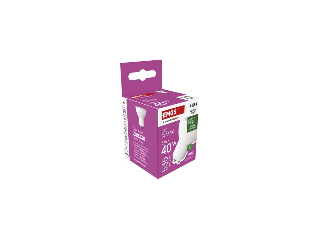 farba svetla: neutrálna biela|energetická trieda: A|index podania farieb (CRI): 80|kompatibilita: neuvádza sa|náhrada za žiarovku: 40 W|napätie: 230 V~/50 Hz|notifikácia do mobilnej aplikácie: neuvádza sa|ovládanie hlasovými asistentmi: neuvádza sa|pätica:| neuvádza sa|počet spínacích cyklov: 30 000|podporované OS: neuvádza sa|prenosová frekvencia: neuvádza sa|príkon: 3 W|predajný obal: 1 ks, krabička|protokol: neuvádza sa|rad: CLASSIC|rozmer: 50 × 50 × 5 210 lm/W|svetelný tok: 535 lm|technológia: LED|teplota chromatičnosti: 4 000 K|tvar: MR16|typ čipov: SMD|účinník: 0,54|uhol vyžarovania: 100°|záručná doba: 5 rokov|Dodatočné parametre