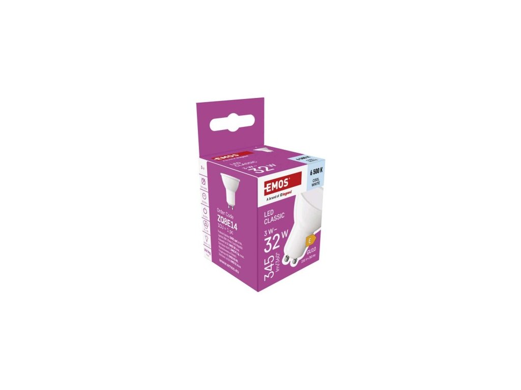 farba svetla: studená biela|energetická trieda: E|index podania farieb (CRI): 80|kompatibilita: –|náhrada za žiarovku: 32 W|napätie: 230 V~/50 Hz|notifikácia do mobilnej aplikácie: ne|ovládanie hlasovými asistentmi: ne|pätica (uchytenie žiarovky):| cyklov: 30 000|podporované OS: –|prenosová frekvencia: –|príkon: 3 W|predajný obal: 1 ks, krabička|protokol: –|rad: CLASSIC|rozmer: 50 × 50 × 58 mm|stmievateľná: ne|svetelná účinnosť: ne|svetelná účinnosť 345 lm|technológia: LED|teplota chromatickosti: 6 500 K|tvar: MR16|typ čipov: SMD|účinník: 0,40|uhol vyžarovania: 100°|záručná doba: 3 roky|životnosť: 30 000 hodínDodatočné parametre
