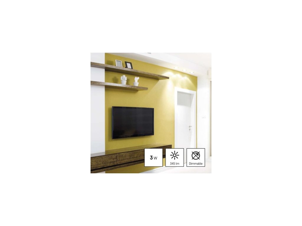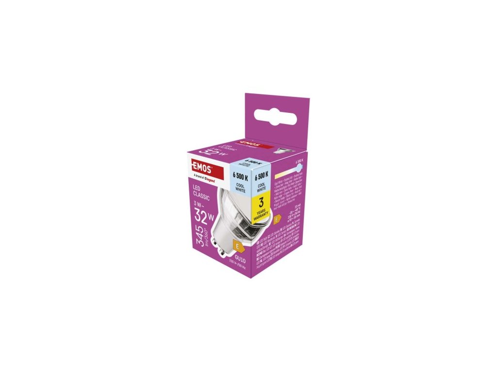 farba svetla: studená biela|energetická trieda: E|index podania farieb (CRI): 80|kompatibilita: –|náhrada za žiarovku: 32 W|napätie: 230 V~/50 Hz|notifikácia do mobilnej aplikácie: ne|ovládanie hlasovými asistentmi: ne|pätica (uchytenie žiarovky):| cyklov: 30 000|podporované OS: –|prenosová frekvencia: –|príkon: 3 W|predajný obal: 1 ks, krabička|protokol: –|rad: CLASSIC|rozmer: 50 × 50 × 55 mm|stmievateľná: ne|svetelná účinnosť: ne|svetelná účinnosť 345 lm|technológia: LED|teplota chromatickosti: 6 500 K|tvar: MR16|typ čipov: SMD|účinník: 0,40|uhol vyžarovania: 100°|záručná doba: 3 roky|životnosť: 30 000 hodínDodatočné parametre