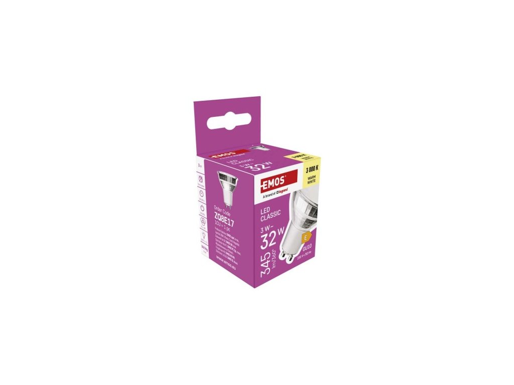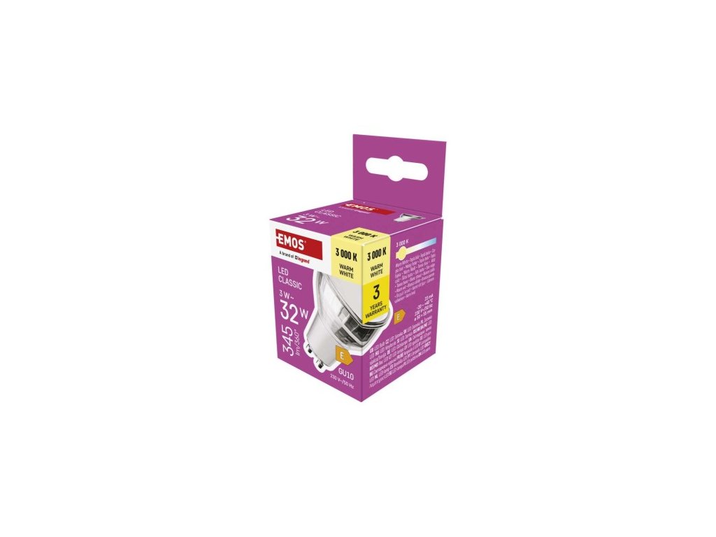 farba svetla: teplá biela|energetická trieda: E|index podania farieb (CRI): 80|kompatibilita: –|náhrada za žiarovku: 32 W|napätie: 230 V~/50 Hz|notifikácia do mobilnej aplikácie: ne|ovládanie hlasovými asistentmi: ne|pätica (uchytenie žiarovky): cyklov: 30 000|podporované OS: –|prenosová frekvencia: –|príkon: 3 W|predajný obal: 1 ks, krabička|protokol: –|rad: CLASSIC|rozmer: 50 × 50 × 55 mm|stmievateľná: ne|svetelná účinnosť: ne|svetelná účinnosť 345 lm|technológia: LED|teplota chromatickosti: 3 000 K|tvar: MR16|typ čipov: SMD|účnik: 0,40|uhol vyžarovania: 100°|záručná doba: 3 roky|životnosť: 30 000 hodínDodatočné parametre