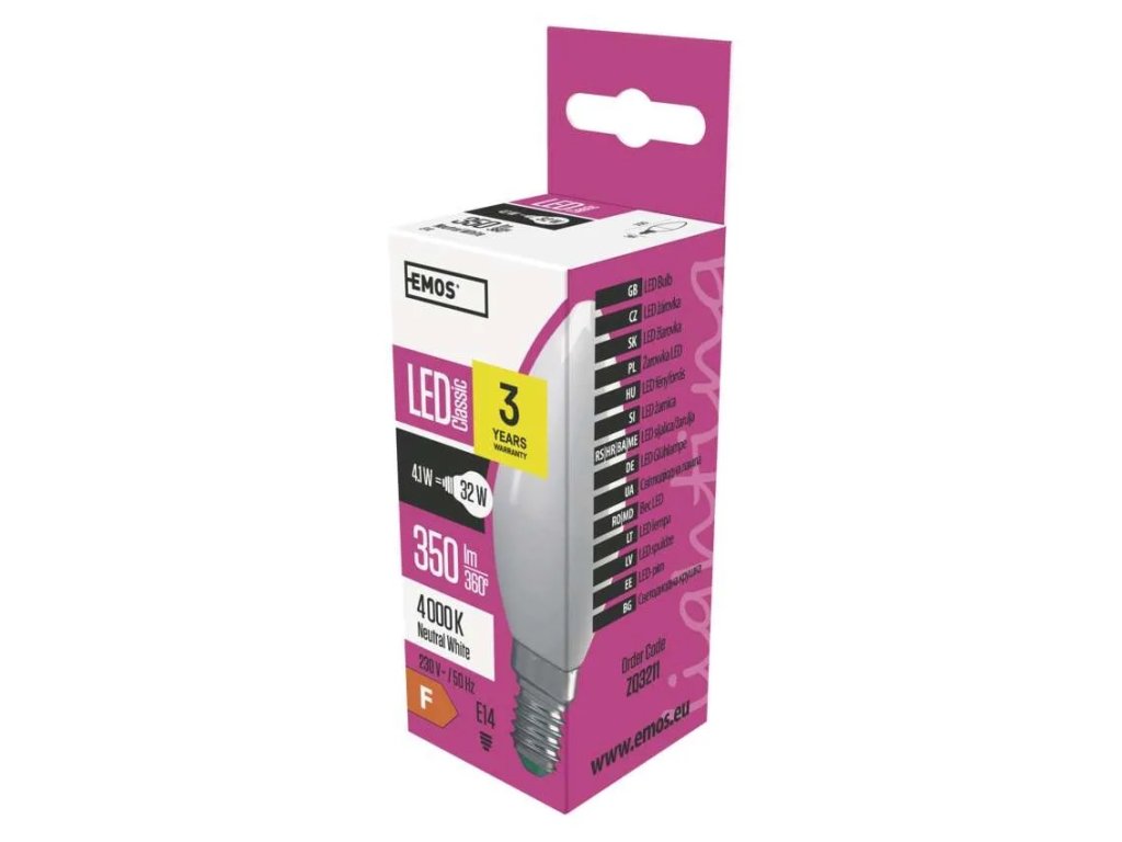 farba svetla: neutrálna biela|energetická trieda: F|index podania farieb (CRI): 80|kompatibilita: –|náhrada za žiarovku: 32 W|napätie: 230 V~/50 Hz|notifikácia do mobilnej aplikácie: –|ovládanie hlasovými asistentmi: –|pätica (uchytenie žiarovky):| cyklov: 25 000|podporované OS: –|prenosová frekvencia: –|príkon: 4,1 W|predajný obal: 1 ks, krabička|protokol: –|rad: CLASSIC|rozmer: 100 × 38 × 38 mm|stmievateľná: ne|seľ: 350 lm|technológia: LED|teplota chromatickosti: 4 000 K|tvar: sviečka|typ čipov: SMD|účinník: 0,49|uhol vyžarovania: 210°|záručná doba: 3 roky|životnosť: 30 000 hodínDodatočné parametre