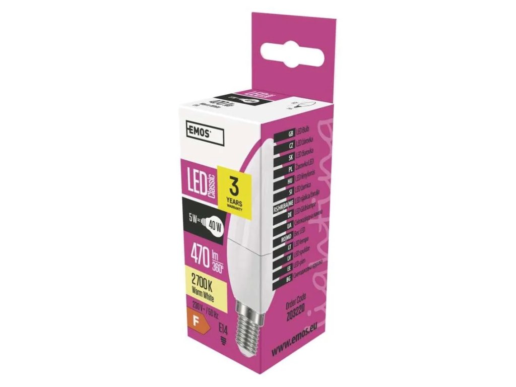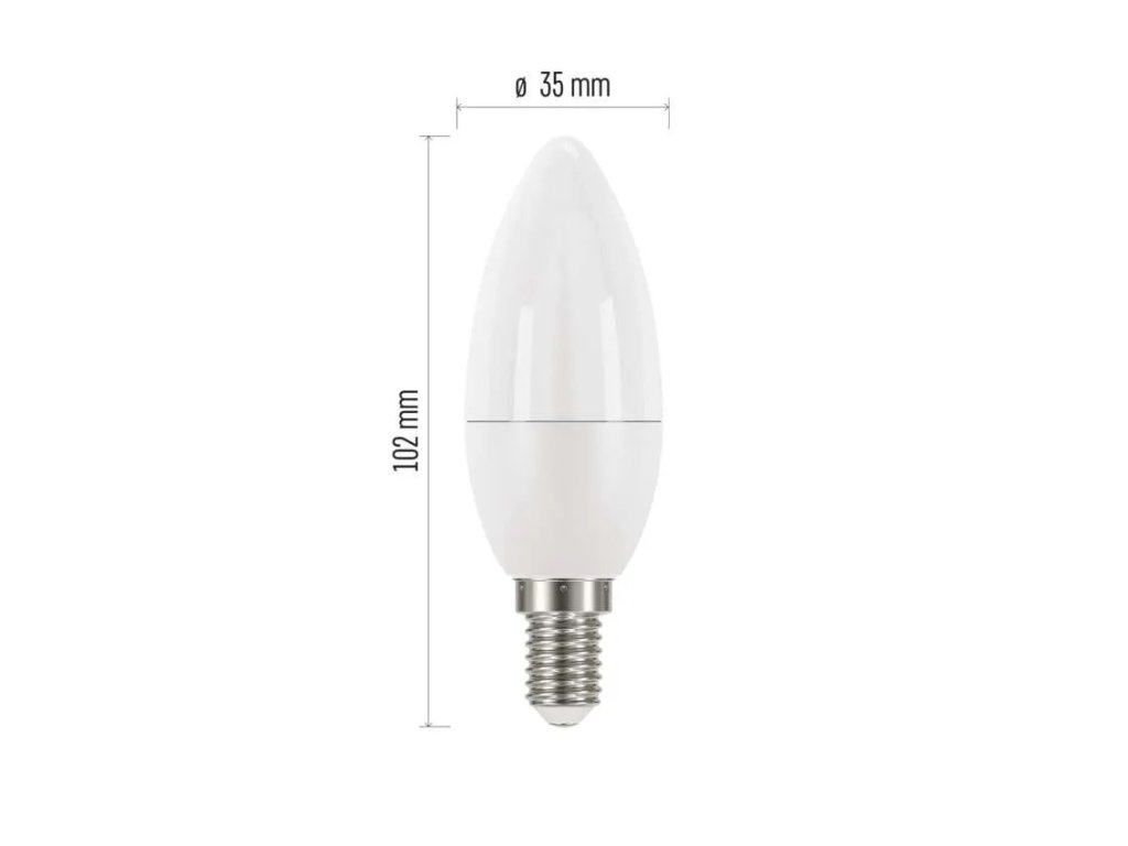 farba svetla: teplá biela|energetická trieda: F|index podania farieb (CRI): 80|kompatibilita: –|náhrada za žiarovku: 40 W|napätie: 230 V~/50 Hz|notifikácia do mobilnej aplikácie: –|ovládanie hlasovými asistentmi: –|pätica (uchytenie žiarovky):| cyklov: 25 000|podporované OS: –|prenosová frekvencia: –|príkon: 5 W|predajný obal: 1 ks, krabička|protokol: –|rad: CLASSIC|rozmer: 102 × 35 × 35 mm|stmievateľná: ne|svetelná 470 lm|technológia: LED|teplota chromatickosti: 2 700 K|tvar: sviečka|typ čipov: SMD|účnik: 0,51|uhol vyžarovania: 270°|záručná doba: 3 roky|životnosť: 30 000 hodínDodatočné parametre