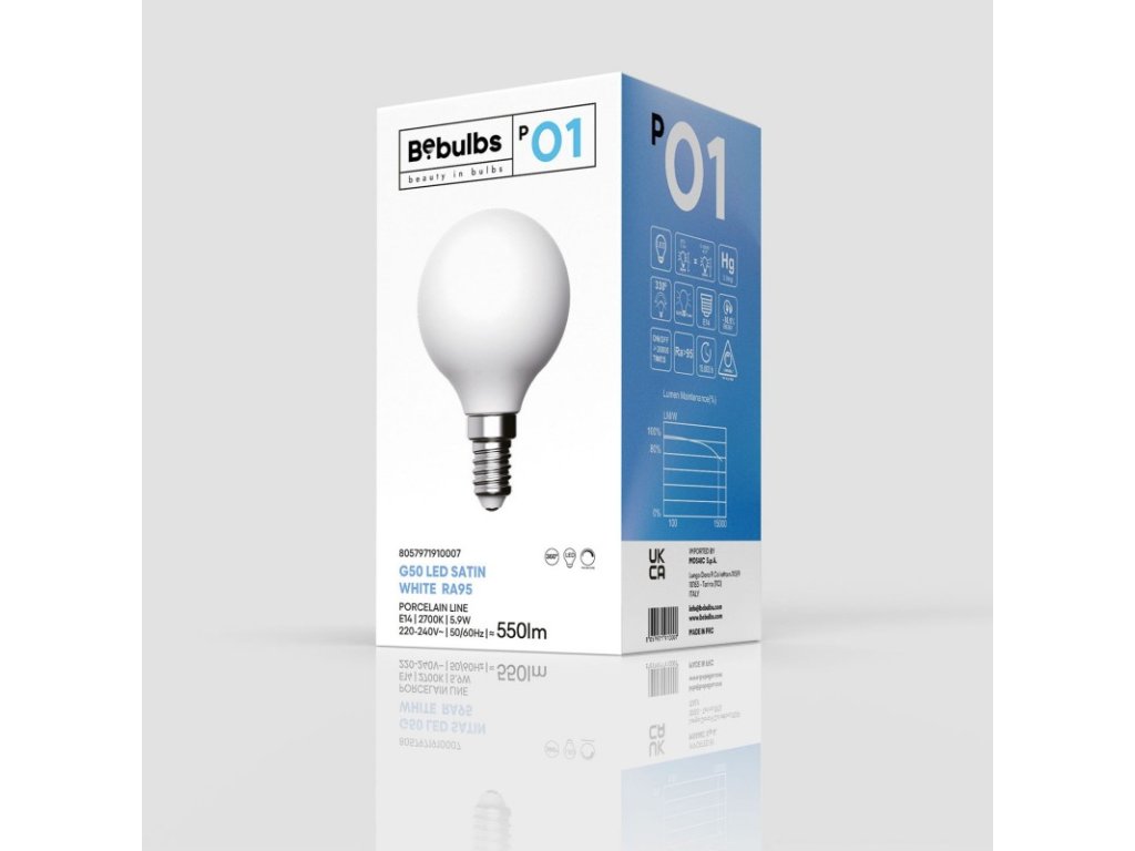 LED žiarovka so závitom E14, index podania farieb CRI 95, okrúhly tvar G50, sklenený povrch s porcelánovým efektom, 5,9 W, 2700 K, stmievateľná. Vysoko kvalitný výrobok, ktorý ponúka homogénne, teplé a príjemné svetlo, ideálny na osvetlenie domácich priestorov, ako sú obývacie izby, spálne a kuchyne. Vlastnosti LED žiarovka E14 CRI 95 G50 - P01 sa vyznačuje päticou E14, ktorá umožňuje jednoduchú inštaláciu do existujúcich svietidiel. Okrem toho má žiarovka vysoký index podania farieb (CRI) 95, čo znamená, že zobrazuje farby veľmi presne. Povrchová úprava Porcelánový efekt povrchu skla vytvára homogénne svetlo, vďaka ktorému je žiarovka LED E14 CRI 95 G50 obzvlášť elegantná a dodá štýl každému prostrediu, v ktorom je umiestnená. Nepriehľadný matný biely povrch zaistí rovnomerné rozptýlené svetlo, preto je žiarovka vhodná aj pre stolné lampy, nástenné svietidlá, a závesné lampy.