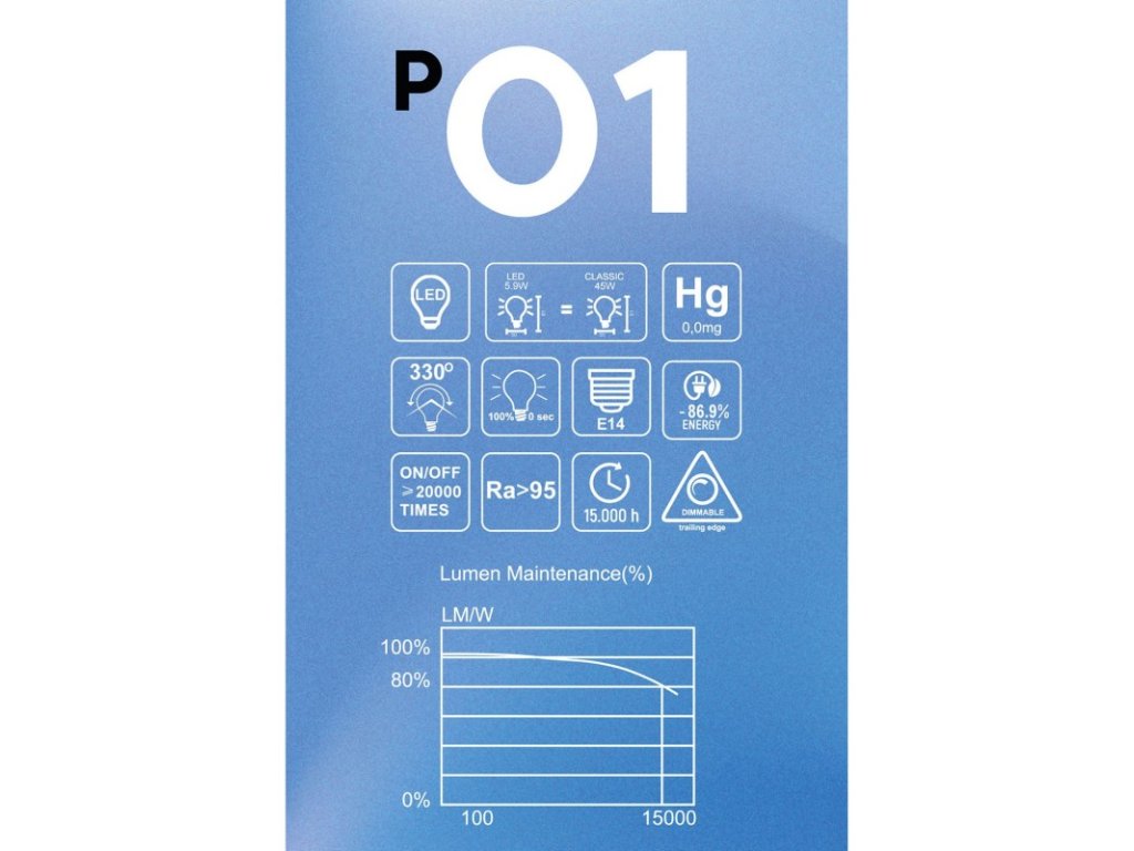 Úspora energie So spotrebou iba 5.9 wattov ponúka výraznú úsporu energie. Okrem toho má P01 dlhú životnosť, ktorá presahuje 15 000 hodín prevádzky, čo znižuje nutnosť častej výmeny žiaroviek. Farba a intenzita Táto žiarovka s 2700 K - teplá biela - vytvára teplé a príjemné svetlo, ideálne na vytvorenie odpočinkovej a príjemnej atmosféry. Táto žiarovka je tiež stmievateľná, čo znamená, že intenzitu svetla je možné nastaviť podľa potreby. Táto funkcia je obzvlášť užitočná v prostredí, ako sú spálne alebo jedálne, kde je žiaduce mäkké svetlo. Tvar A konečne, žiarovka LED G50 má elegantný a moderný tvar, ktorý sa dokonale hodí do každého typu interiéru.