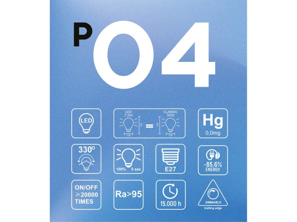 Úspora energie Spotreba iba 7.2 watt z nej robí skvelú voľbu pre tých, ktorí chcú šetriť energiou. Navyše je tu dlhá životnosť presahujúca 15,000 hodín používania, čím odpadá potreba častej výmeny žiaroviek. Farba a intenzita Žiarovka P04 má teplé biele svetlo s teplotou 2700K a vytvára tak teplé a prívetivé osvetlenie. Žiarovka je taktiež stmievateľná, to vám navyše umožňuje nastaviť intenzitu svetla podľa vašich potrieb a preferencií. Funkcia stmievania je užitočná predovšetkým v spálňach, jedálňach a všade tam, kde občas chceme jemné svetlo. Tvar A konečne jej okrúhly tvar glóbusu s priemerom 125mm (G125), elegantný a moderný, ktorý sa skvele hodí k akémukoľvek štýlu a priestoru.