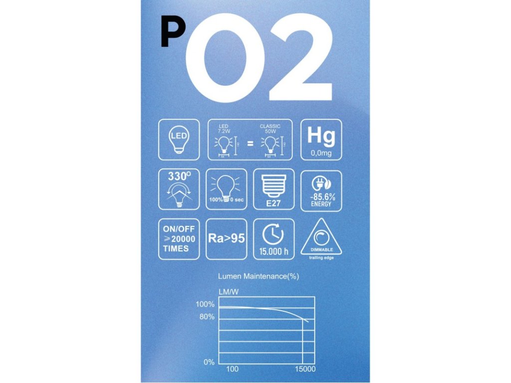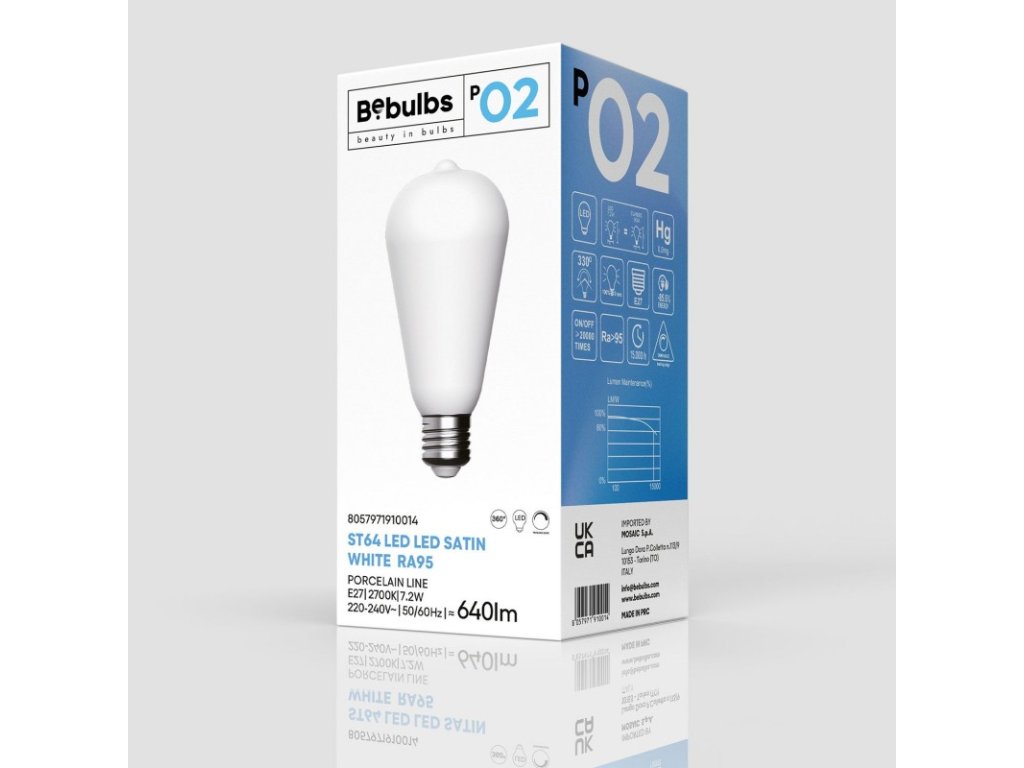 "Porcelánová" LED žiarovka so závitom E27, tvar ST64, porcelánová povrchová úprava, 7.2W, 2700K stmievateľná. Moderný a rafinovaný prvok osvetlenia, ktorý je možné použiť v rôznych prostrediach, od obývacej izby po spálňu, od pracovne po kuchyňu. Vlastnosti Žiarovka P02 sa vďaka závitu E27 ľahko inštaluje do existujúcich svietidiel, čím je zaistené maximálne praktické použitie. Má vysoký index podania farieb (CRI) 95, čo znamená, že farby sú v jej svetle vykreslené veľmi presne a prirodzene.