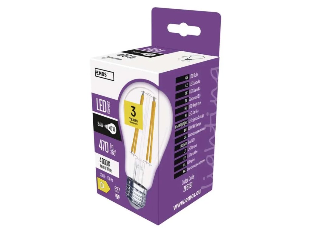 LED žiarovka s päticou E27 s príkonom 3,4W, s výkonom 470 lm lúmenov (náhrada za žiarovku 40W).