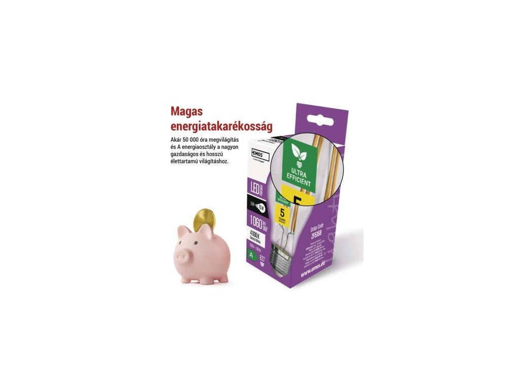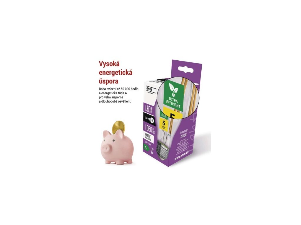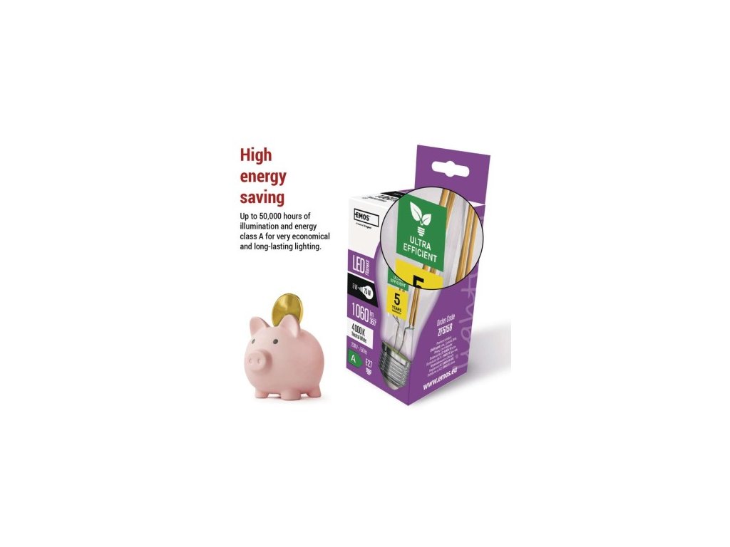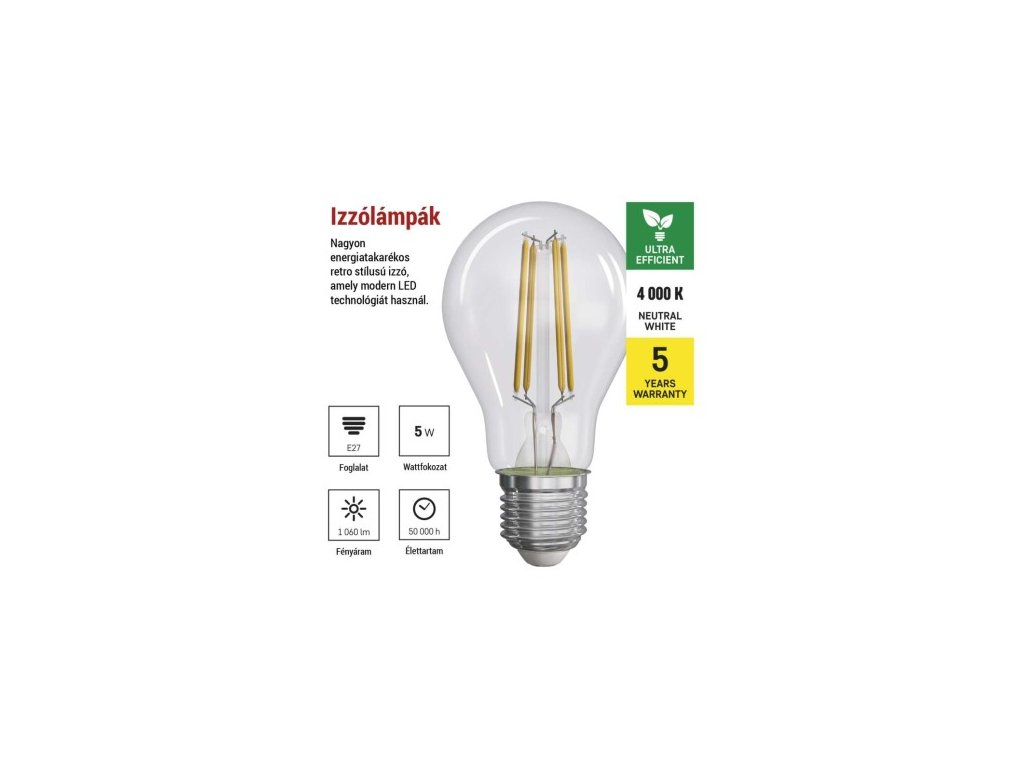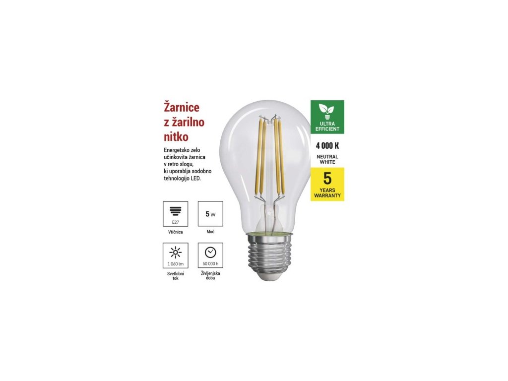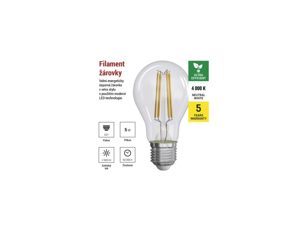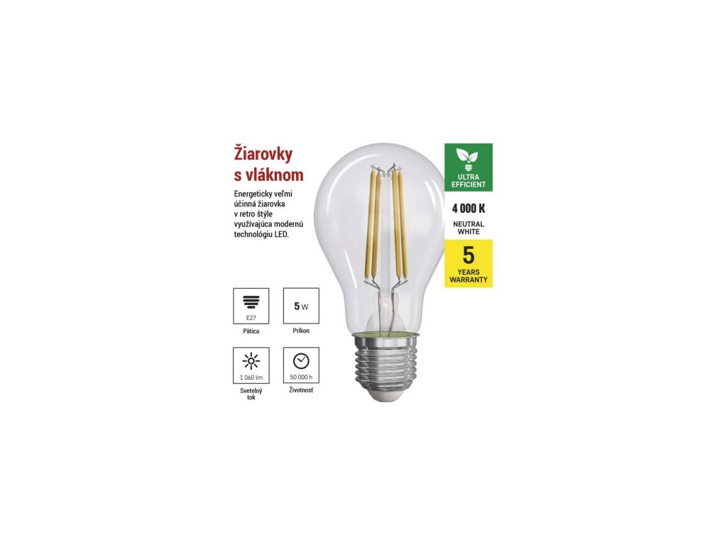 farba svetla: neutrálna biela|energetická trieda: A|index podania farieb (CRI): 80|kompatibilita: –|náhrada za žiarovku: 75 W|napätie: 230 V~/50 Hz|notifikácia do mobilnej aplikácie: –|ovládanie hlasovými asistentmi: –|pätica (uchytenie žiarovky): 30 000|podporované OS: –|prenosová frekvencia: –|príkon: 5 W|predajný obal: 1 ks, krabička|protokol: –|rad: FILAMENT|rozmer: 60 × 60 × 105 mm|stmievateľná: ne|svetelná účinnosť: 212 l lm|technológia: LED|teplota chromatickosti: 4 000 K|tvar: A60|typ čipov: COB|účinník: 0,5|uhol vyžarovania: 300°|záručná doba: 5 rokov|životnosť: 50 000 hodínDodatočné parametre