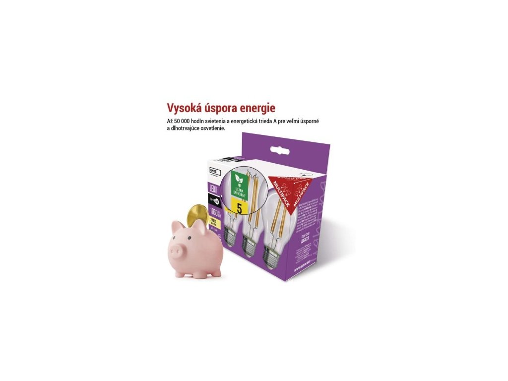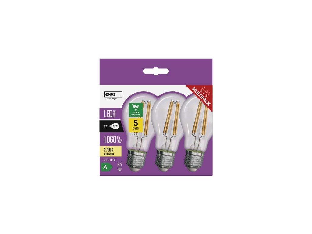 farba svetla: teplá biela|energetická trieda: A|index podania farieb (CRI): 80|kompatibilita: –|náhrada za žiarovku: 75 W|napätie: 230 V~/50 Hz|notifikácia do mobilnej aplikácie: –|ovládanie hlasovými asistentmi: –|pätica (uchytenie žiarovky): E2 30 000|podporované OS: –|prenosová frekvencia: –|príkon: 5 W|predajný obal: 3 ks, krabička|protokol: –|rad: FILAMENT|rozmer: 60 × 60 × 105 mm|stmievateľná: ne|svetelná účinnosť: 212 l lm|technológia: LED|teplota chromatickosti: 2 700 K|tvar: A60|typ čipov: COB|účinník: 0,5|uhol vyžarovania: 300°|záručná doba: 5 rokov|životnosť: 50 000 hodínDodatočné parametre