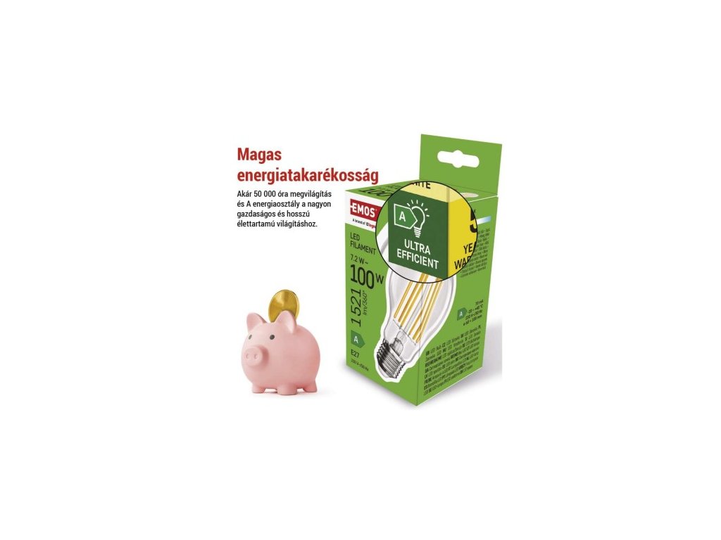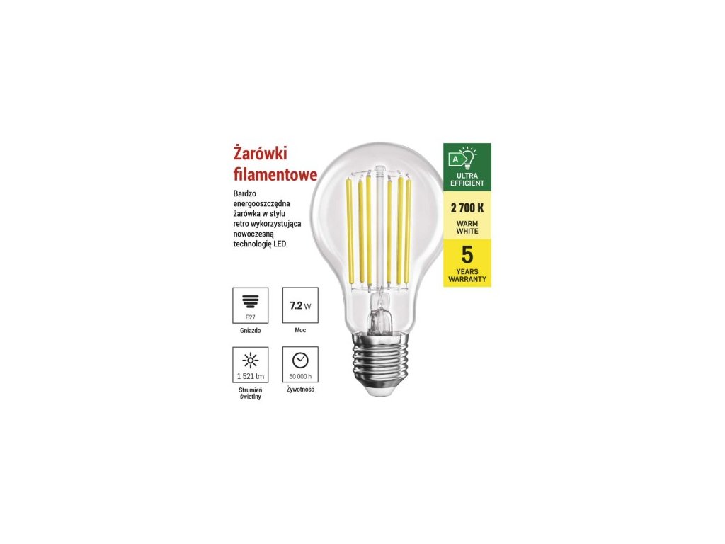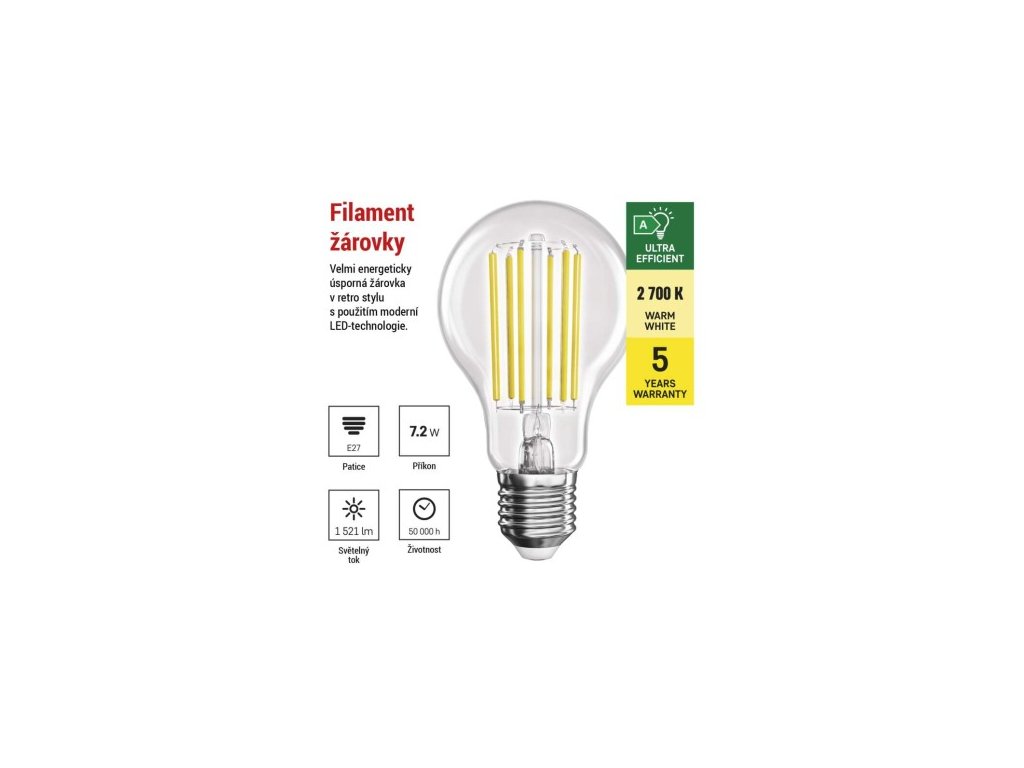 farba svetla: teplá biela|energetická trieda: A|index podania farieb (CRI): 80|kompatibilita: neuvádza sa|náhrada za žiarovku: 100 W|napätie: 230 V~/50 Hz|notifikácia do mobilnej aplikácie: neuvádza sa|ovládanie hlasovými asistentmi: neuvádza sa|pätica:| neuvádza sa|počet spínacích cyklov: 30 000|podporované OS: neuvádza sa|prenosová frekvencia: neuvádza sa|príkon: 7,2 W|predajný obal: 1 ks, krabička|protokol: neuvádza sa|rada: FILAMENT|rozmer: 60 × 60 × 60 × účinnosť: 211 lm/W|svetelný tok: 1 521 lm|technológia: LED|teplota chromatičnosti: 2 700 K|tvar: A60|typ čipov: COB|účinník: 0,58|uhol vyžarovania: 360°|5 záručná doba:0Dodatočné parametre