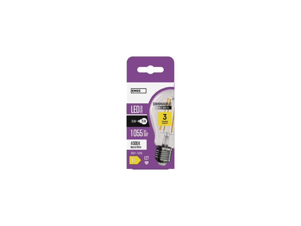 farba svetla: neutrálna biela|energetická trieda: D|index podania farieb (CRI): 80|kompatibilita: neuvádza sa|náhrada za žiarovku: 75 W|napätie: 230 V~/50 Hz|notifikácia do mobilnej aplikácie: neuvádza sa|ovládanie hlasovými asistentmi: neuvádza sa|pätica:| neuvádza sa|počet spínacích cyklov: 25 000|podporované OS: neuvádza sa|prenosová frekvencia: neuvádza sa|príkon: 7,5 W|predajný obal: 1 ks, krabička|protokol: neuvádza sa|rada: FILAMENT|rozmer: 60 × 60 × 60 × účinnosť: 141 lm/W|svetelný tok: 1 055 lm|technológia: LED|teplota chromatičnosti: 4 000 K|tvar: A60|typ čipov: COB|účinník: 0,73|uhol vyžarovania: 320°|2 záručná doba:0Dodatočné parametre