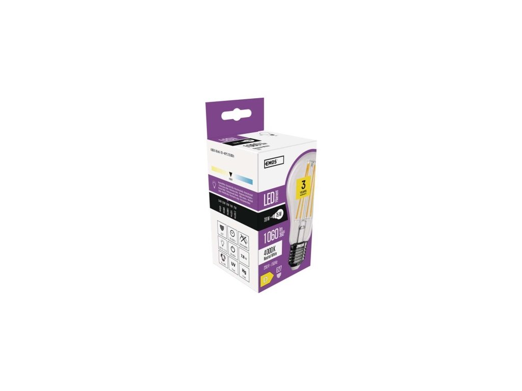 farba svetla: neutrálna biela|energetická trieda: D|index podania farieb (CRI): 80|kompatibilita: neuvádza sa|náhrada za žiarovku: 75 W|napätie: 230 V~/50 Hz|notifikácia do mobilnej aplikácie: neuvádza sa|ovládanie hlasovými asistentmi: neuvádza sa|pätica:| 4|počet spínacích cyklov: 25 000|podporované OS: neuvádza sa|prenosová frekvencia: neuvádza sa|príkon: 7,8 W|predajný obal: 1 ks, krabička|protokol: neuvádza sa|rad: FILAMENT|rozmer: 108 × 60 × 6 136 lm/W|svetelný tok: 1 060 lm|technológia: LED|teplota chromatičnosti: 4 000 K|tvar: A60|typ čipov: COB|účinník: 0,53|uhol vyžarovania: 320°|záručná doba: 0 roky|Dodatočné parametre