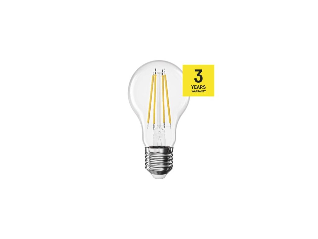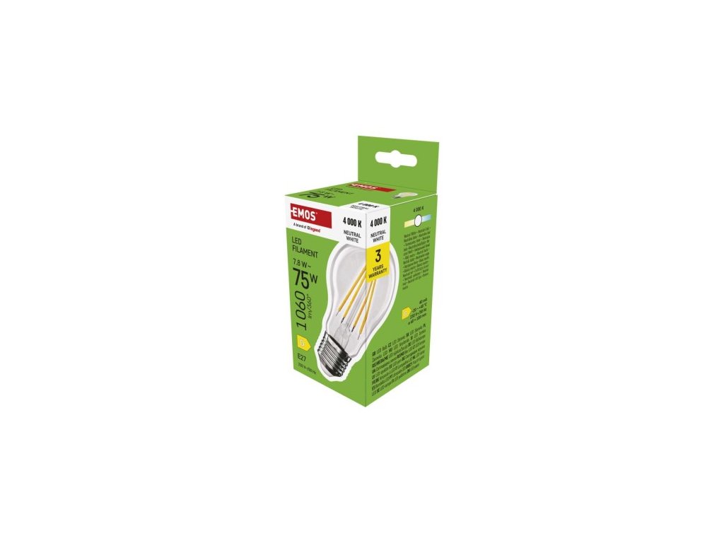 farba svetla: neutrálna biela|energetická trieda: D|index podania farieb (CRI): 80|kompatibilita: –|náhrada za žiarovku: 75 W|napätie: 230 V~/50 Hz|notifikácia do mobilnej aplikácie: ne|ovládanie hlasovými asistentmi: ne|pätica (uchytenie žiarovky): E| 25 000|podporované OS: –|prenosová frekvencia: –|príkon: 7,8 W|predajný obal: 1 ks, krabička|protokol: –|rad: FILAMENT|rozmer: 108 × 60 × 60 mm|stmievateľná: ne|svetelná účinnosť: ne|svetelná účinnosť: 060 lm|technológia: LED|teplota chromatickosti: 4 000 K|tvar: A60|typ čipov: COB|účinník: 0,50|uhol vyžarovania: 360°|záručná doba: 3 roky|životnosť: 25 000 hodínDodatočné parametre
