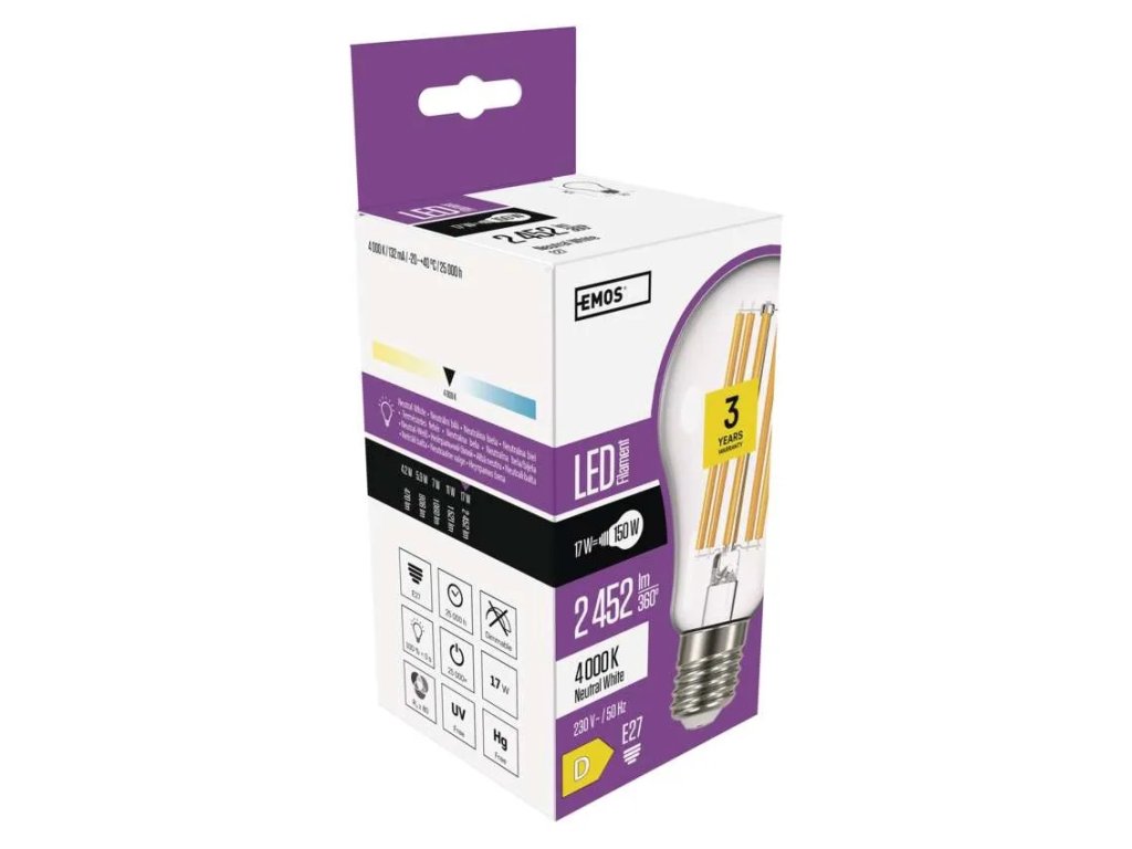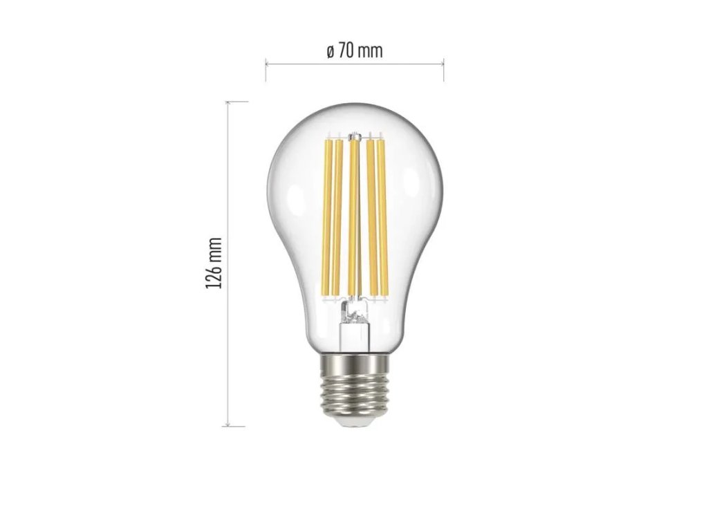 farba svetla: neutrálna biela|energetická trieda: D|index podania farieb (CRI): 80|kompatibilita: –|náhrada za žiarovku: 150 W|napätie: 230 V~/50 Hz|notifikácia do mobilnej aplikácie: –|ovládanie hlasovými asistentmi: –|pätica (uchytenie žiarovky4): cyklov: 25 000|podporované OS: –|prenosová frekvencia: –|príkon: 17 W|predajný obal: 1 ks, krabička|protokol: –|rad: FILAMENT|rozmer: 126 × 70 × 70 mm|stmievateľná: ne|svetelná 452 lm|technológia: LED|teplota chromatickosti: 4 000 K|tvar: A67|typ čipov: COB|účinník: 0,93|uhol vyžarovania: 320°|záručná doba: 3 roky|životnosť: 25 000 hodínDodatočné parametre