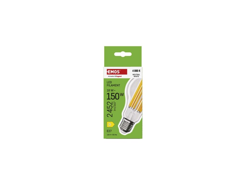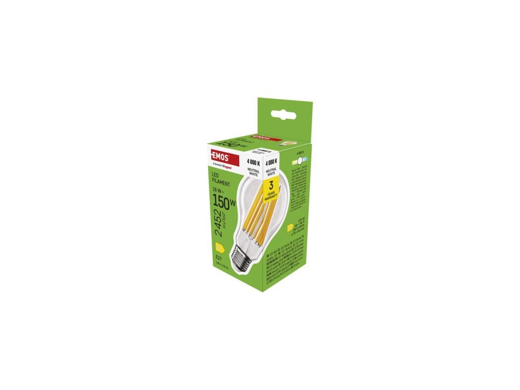 farba svetla: neutrálna biela|energetická trieda: D|index podania farieb (CRI): 80|kompatibilita: –|náhrada za žiarovku: 150 W|napätie: 230 V~/50 Hz|notifikácia do mobilnej aplikácie: ne|ovládanie hlasovými asistentmi: ne|pätica (uchytenie žiarovky): cyklov: 25 000|podporované OS: –|prenosová frekvencia: –|príkon: 18 W|predajný obal: 1 ks, krabička|protokol: –|rad: FILAMENT|rozmer: 70 × 70 × 126 mm|stmievateľná: ne|svetelná účinnosť: 452 lm|technológia: LED|teplota chromatickosti: 4 000 K|tvar: A70|typ čipov: COB|účinník: 0,50|uhol vyžarovania: 360°|záručná doba: 3 roky|životnosť: 25 000 hodínDodatočné parametre
