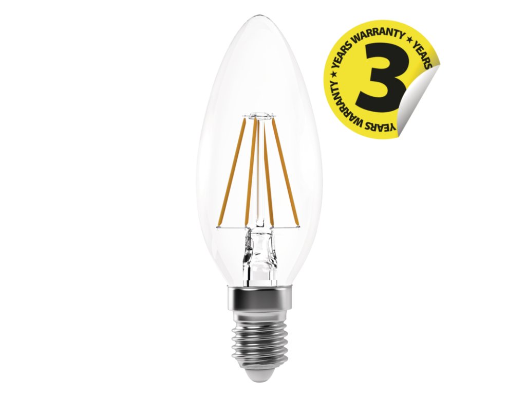LED žiarovka v tvare sviečky s päticou E14 s výkonom 3,4 W, 470 lúmenov (náhrada za žiarovku 40 W) Farba svetla teplá biela 2700 Kelvinov, 25.000 hod. svietivosti, uhol vyžarovania 320 °. Svetelný zdroj nie je stmievateľný.