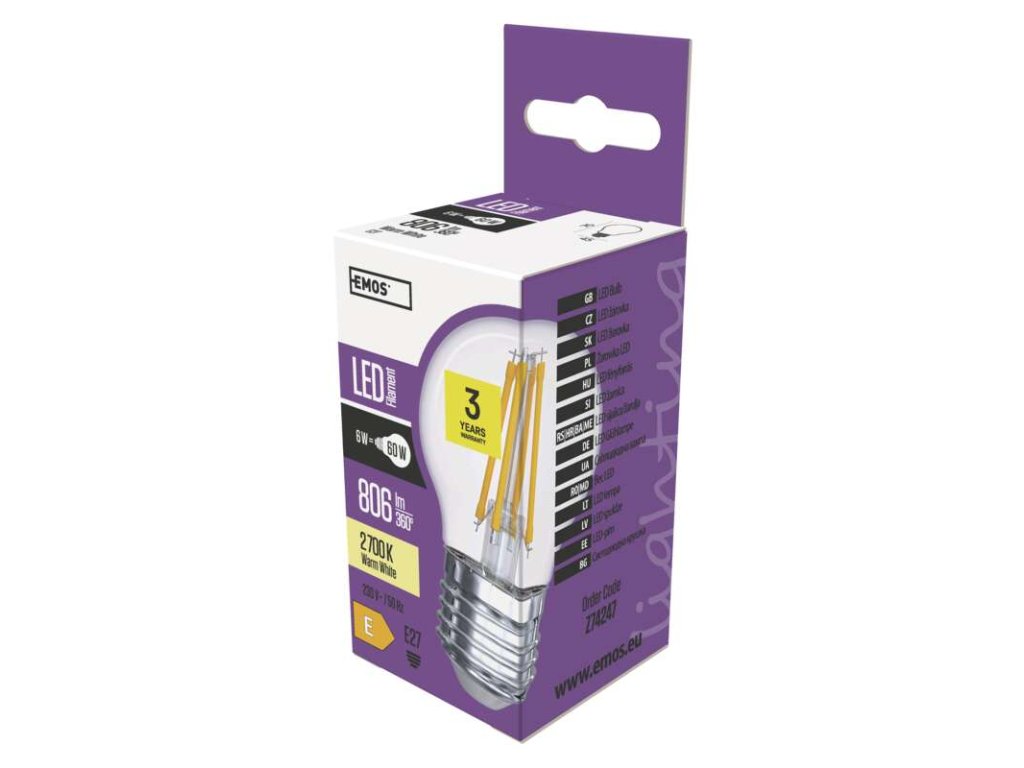 LED žiarovka s päticou E27 s výkonom 6W, 810 lúmenov (náhrada za žiarovku 60W). Farba svetla teplá biela 2700 Kelvinov, 30.000 hod. svietivosti, uhol vyžarovania 300 °. Svetelný zdroj nie je stmievateľný.