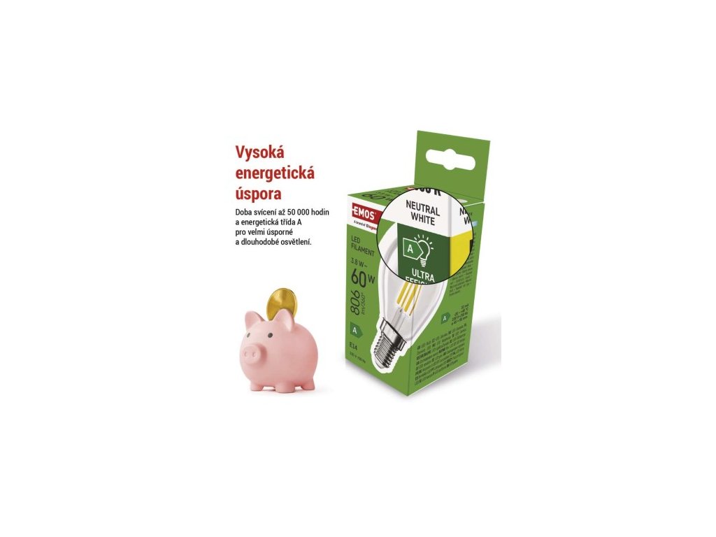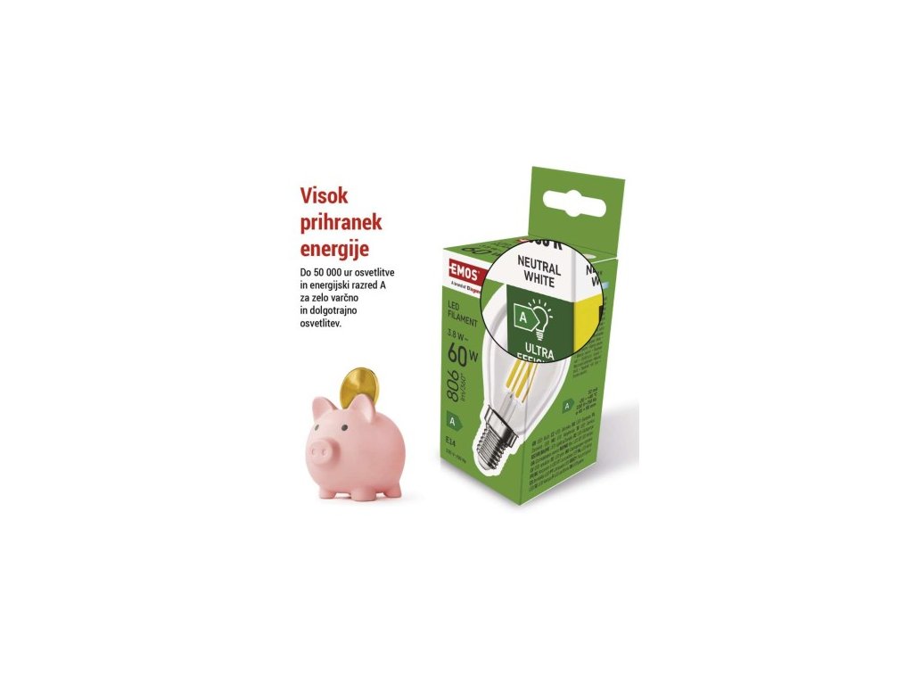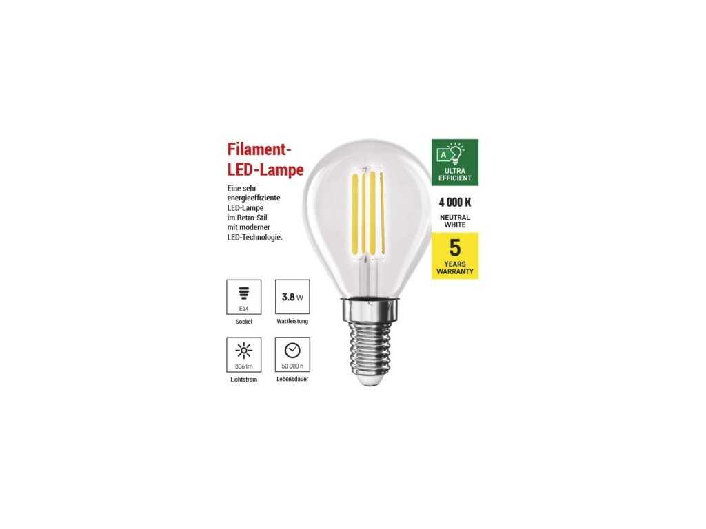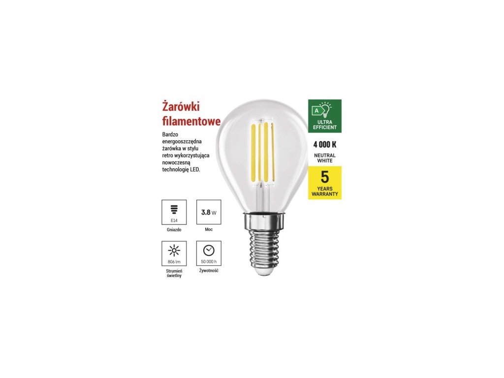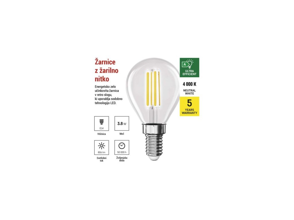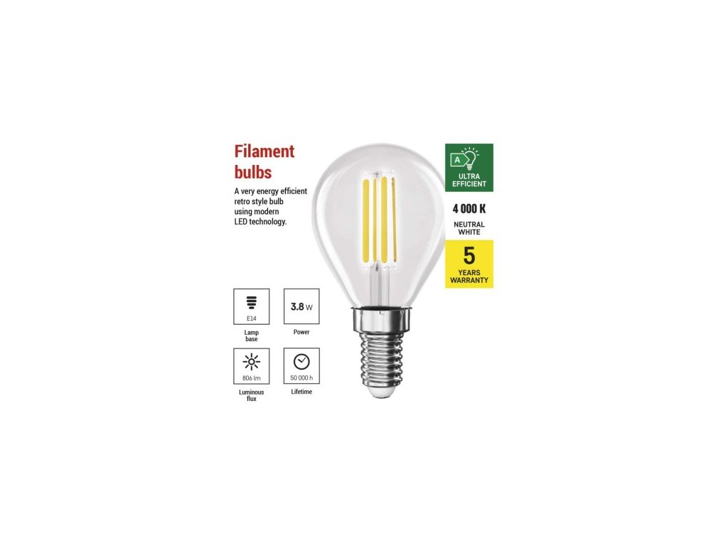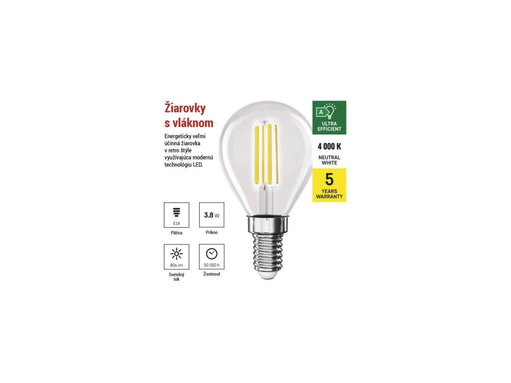 farba svetla: neutrálna biela|energetická trieda: A|index podania farieb (CRI): 80|kompatibilita: neuvádza sa|náhrada za žiarovku: 60 W|napätie: 230 V~/50 Hz|notifikácia do mobilnej aplikácie: neuvádza sa|ovládanie hlasovými asistentmi: neuvádza sa|pätica:| 4|počet spínacích cyklov: 30 000|podporované OS: neuvádza sa|prenosová frekvencia: neuvádza sa|príkon: 3,8 W|predajný obal: 1 ks, krabička|protokol: neuvádza sa|rad: FILAMENT|rozmer: 45 × 45 × 80; účinnosť: 212 lm/W|svetelný tok: 806 lm|technológia: LED|teplota chromatičnosti: 4 000 K|tvar: Mini Globe|typ čipov: COB|účinník: 0,5|uhol vyžarovania: 360°|záručná doba: 0 rokov|