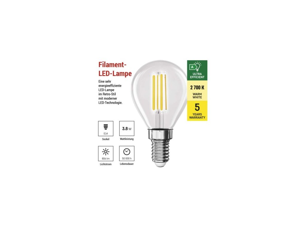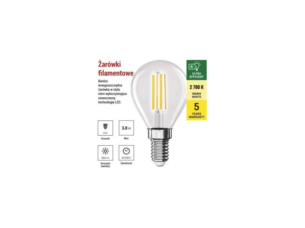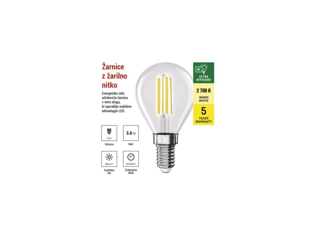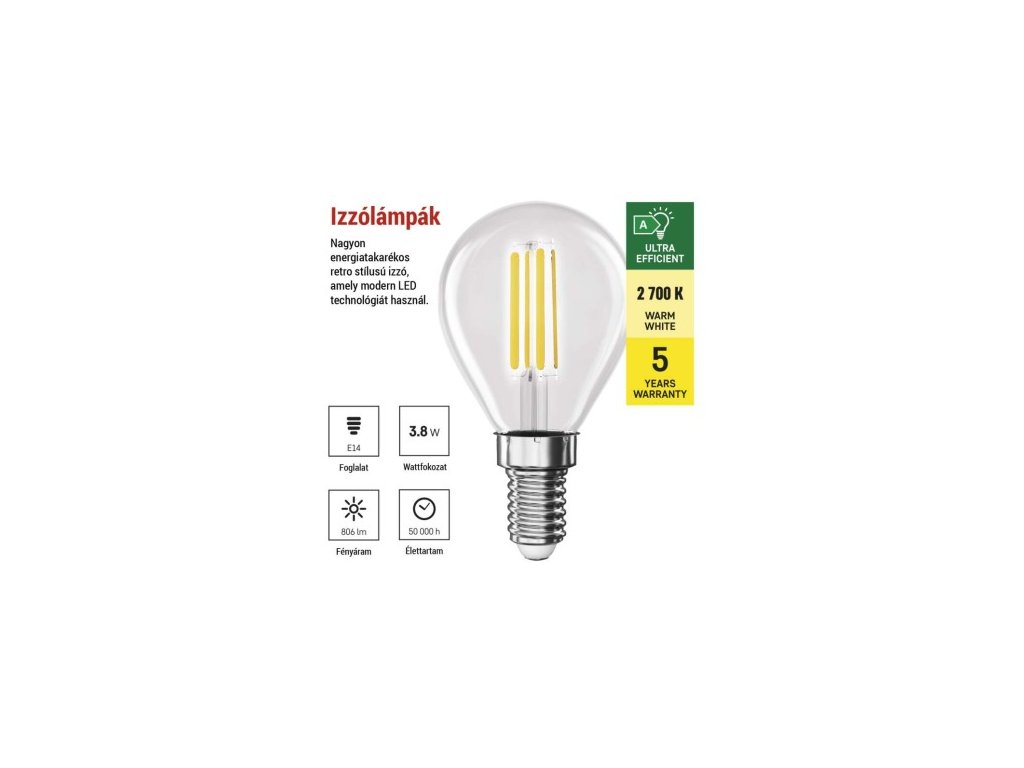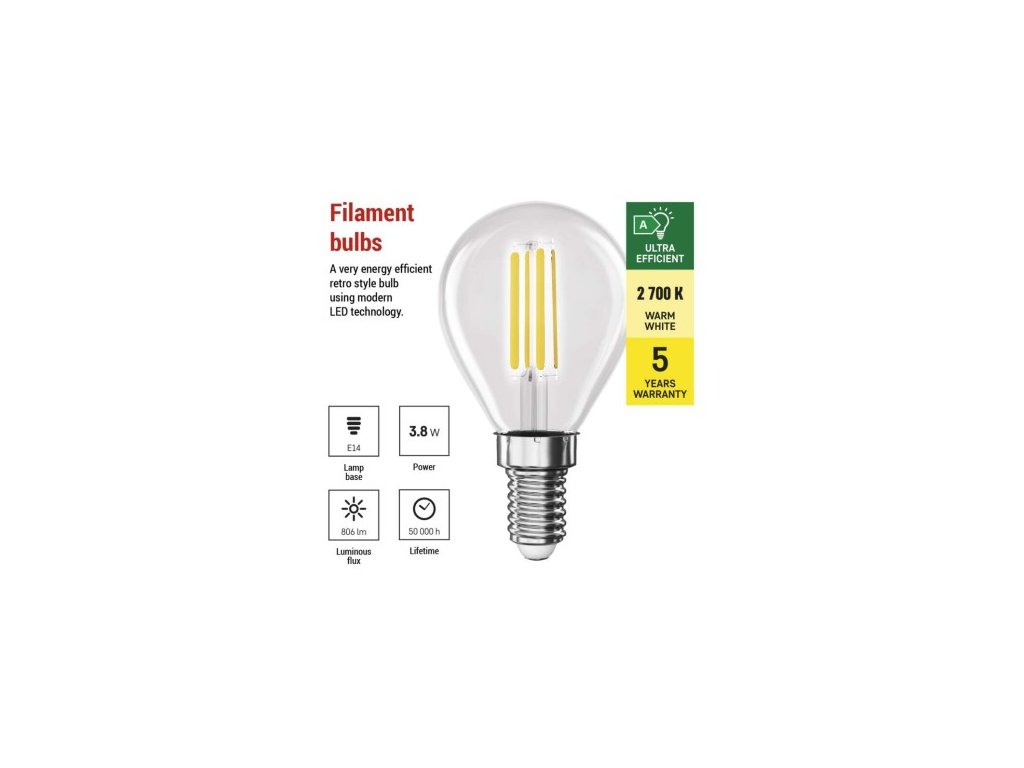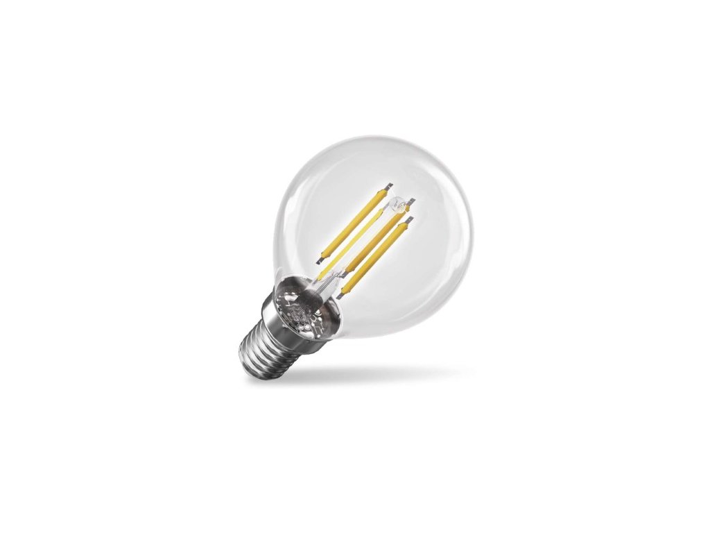 farba svetla: teplá biela|energetická trieda: A|index podania farieb (CRI): 80|kompatibilita: neuvádza sa|náhrada za žiarovku: 60 W|napätie: 230 V~/50 Hz|notifikácia do mobilnej aplikácie: neuvádza sa|ovládanie hlasovými asistentmi: neuvádza sa|pätica: 4|počet spínacích cyklov: 30 000|podporované OS: neuvádza sa|prenosová frekvencia: neuvádza sa|príkon: 3,8 W|predajný obal: 1 ks, krabička|protokol: neuvádza sa|rad: FILAMENT|rozmer: 45 × 45 × 80; účinnosť: 212 lm/W|svetelný tok: 806 lm|technológia: LED|teplota chromatičnosti: 2 700 K|tvar: Mini Globe|typ čipov: COB|účinník: 0,5|uhol vyžarovania: 360°|záručná doba: 0 rokov|