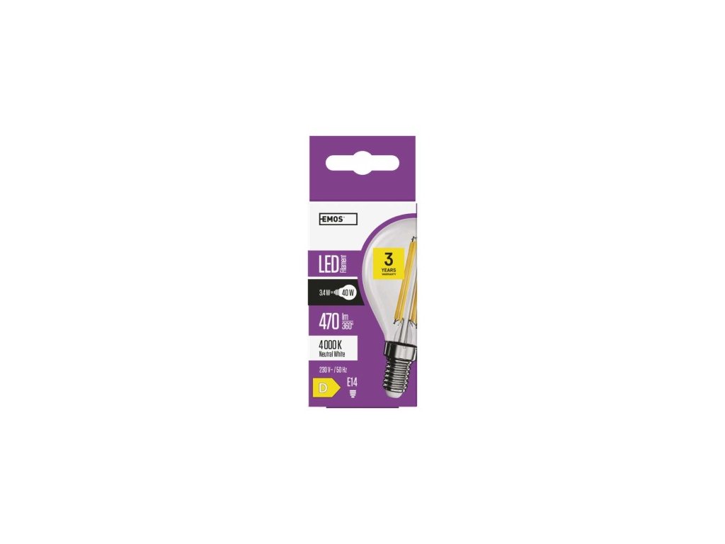 farba svetla: neutrálna biela|energetická trieda: D|index podania farieb (CRI): 80|kompatibilita: –|náhrada za žiarovku: 40 W|napätie: 230 V~/50 Hz|notifikácia do mobilnej aplikácie: –|ovládanie hlasovými asistentmi: –|pätica (uchytenie žiarovky): 25 000|podporované OS: –|prenosová frekvencia: –|príkon: 3,4 W|predajný obal: 1 ks, krabička|protokol: –|rad: FILAMENT|rozmer: 80 × 45 × 45 mm|stmievateľná: ne|svetelná účinnosť: 1 lm|technológia: LED|teplota chromatickosti: 4 000 K|tvar: Mini Globe|typ čipov: COB|účinník: 0,48|uhol vyžarovania: 320°|záručná doba: 3 roky|životnosť: 25 000 hodínDodatočné parametre