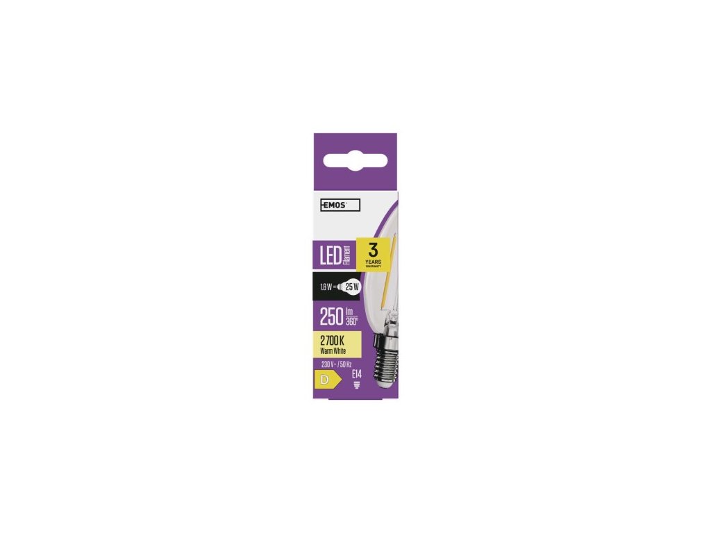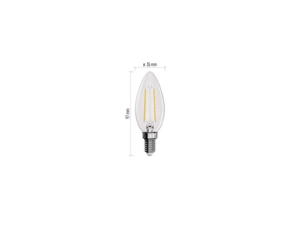 farba svetla: teplá biela|energetická trieda: D|index podania farieb (CRI): 80|kompatibilita: –|náhrada za žiarovku: 25 W|napätie: 230 V~/50 Hz|notifikácia do mobilnej aplikácie: –|ovládanie hlasovými asistentmi: –|pätica (uchytenie žiarovky): E1 25 000|podporované OS: –|prenosová frekvencia: –|príkon: 1,8 W|predajný obal: 1 ks, krabička|protokol: –|rad: FILAMENT|rozmer: 97 × 35 × 35 mm|stmievateľná: ne|svetelná účinnosť: 1| lm|technológia: LED|teplota chromatickosti: 2 700 K|tvar: sviečka|typ čipov: COB|účinník: 0,41|uhol vyžarovania: 320°|záručná doba: 3 roky|životnosť: 25 000 hodínDodatočné parametre