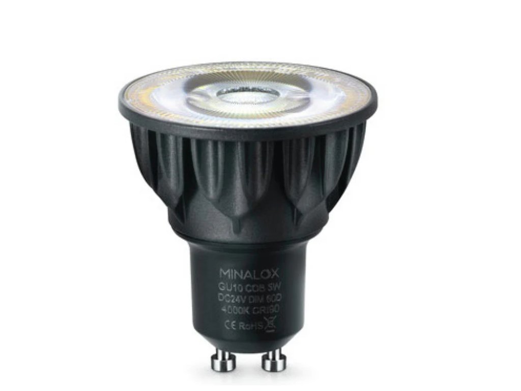 LED stmievateľná žiarovka s päticou GU10, výkonom 5W s COB čipom a uhlom svietenia 60º. Žiarovka má 24V napájanie, je kompatibilná s inteligentnými systémami, ako napríklad Loxone. Žiarovka je pevná, má hliníkové telo a je lakovaná čiernou farbou.