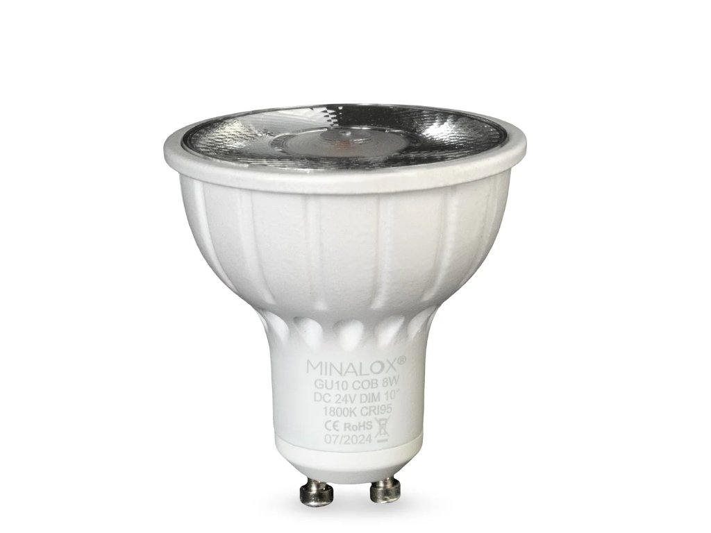 LED stmievateľná žiarovka s päticou GU10, výkonom 8W s COB čipom a uhlom svietenia 10º. Žiarovka má 24V napájanie, je kompatibilná s inteligentnými systémami, ako napríklad Loxone. Žiarovka je pevná, má hliníkové telo a je lakovaná bielou farbou.