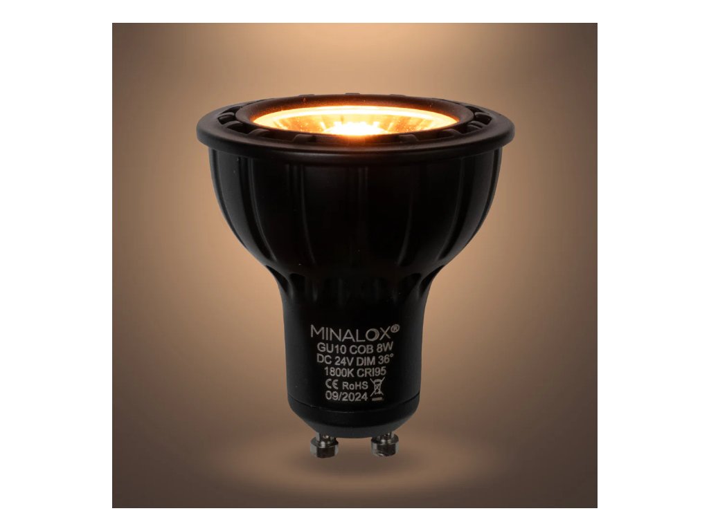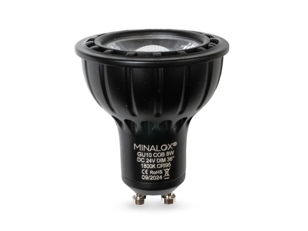 LED stmievateľná žiarovka s päticou GU10, výkonom 8W s COB čipom a uhlom svietenia 36º. Žiarovka má 24V napájanie, je kompatibilná s inteligentnými systémami, ako napríklad Loxone. Žiarovka je pevná, má hliníkové telo a je lakovaná čiernou farbou.