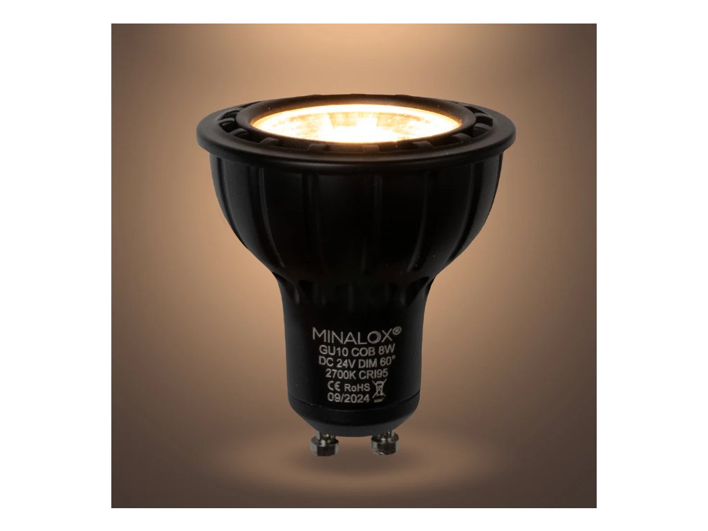 LED stmievateľná žiarovka s päticou GU10, výkonom 8W s COB čipom a uhlom svietenia 60º. Žiarovka má 24V napájanie, je kompatibilná s inteligentnými systémami, ako napríklad Loxone. Žiarovka je pevná, má hliníkové telo a je lakovaná čiernou, tmavo šedou alebo bielou farbou.
