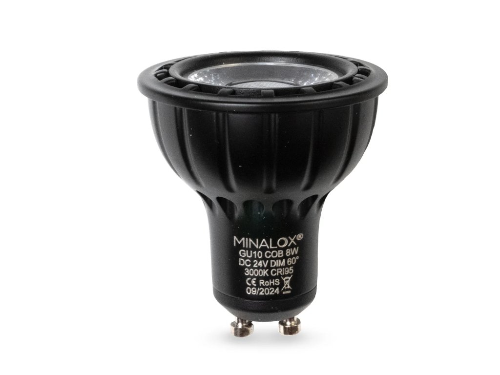 LED stmievateľná žiarovka s päticou GU10, výkonom 8W s COB čipom a uhlom svietenia 60º. Žiarovka má 24V napájanie, je kompatibilná s inteligentnými systémami, ako napríklad Loxone. Žiarovka je pevná, má hliníkové telo a je lakovaná čiernou, tmavo šedou alebo bielou farbou.