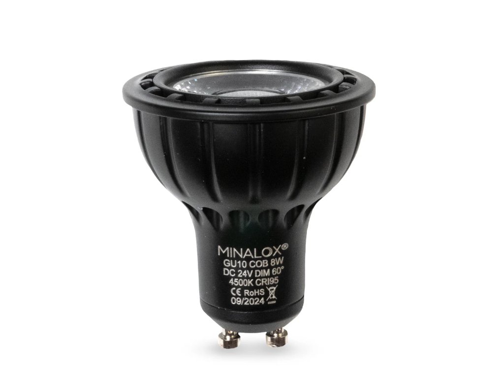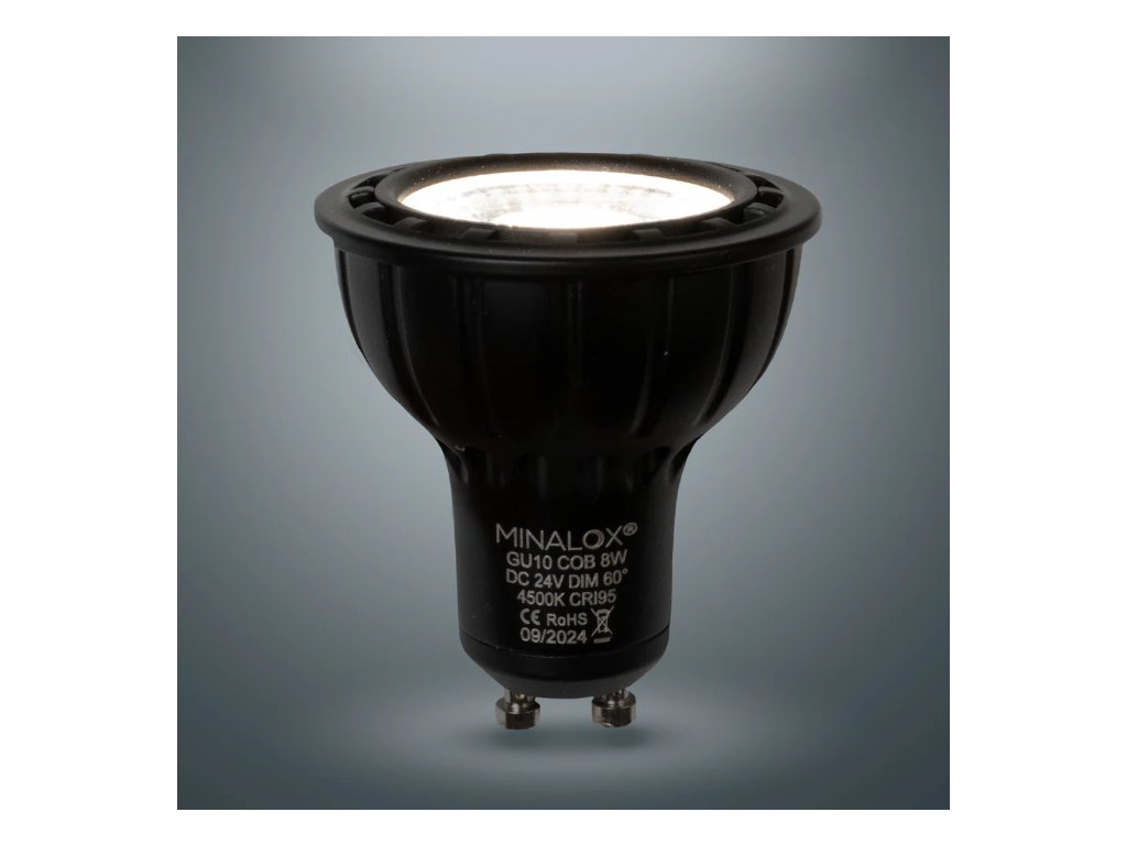 LED stmievateľná žiarovka s päticou GU10, výkonom 8W s COB čipom a uhlom svietenia 60º. Žiarovka má 24V napájanie, je kompatibilná s inteligentnými systémami, ako napríklad Loxone. Žiarovka je pevná, má hliníkové telo a je lakovaná čiernou, tmavo šedou alebo bielou farbou.