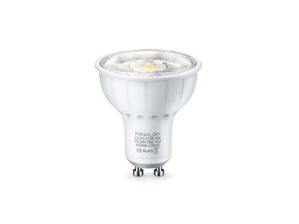 LED stmievateľná žiarovka s päticou GU10, výkonom 8W s COB čipom a uhlom svietenia 10º. Žiarovka má 24V napájanie, je kompatibilná s inteligentnými systémami, ako napríklad Loxone. Žiarovka je pevná, má hliníkové telo a je lakovaná bielou farbou.