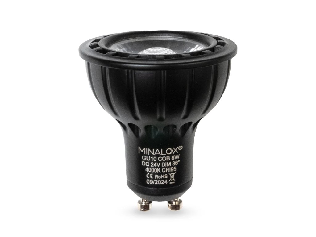 LED stmievateľná žiarovka s päticou GU10, výkonom 8W s COB čipom a uhlom svietenia 36º. Žiarovka má 24V napájanie, je kompatibilná s inteligentnými systémami, ako napríklad Loxone. Žiarovka je pevná, má hliníkové telo a je lakovaná čiernou alebo bielou farbou.