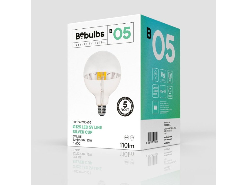 Okrúhly tvar a metalické odlesky má žiarovka B05, ktorá je napájaná iba 5 V prúdom. vytvára zaujímavý svetelný efekt a vyžaruje zasnené, jemné osvetlenie pre uvoľnenú a intímnu atmosféru. Bebulbs, značka, ktorá neustále posúva hranice dizajnu očarujúcich LED žiaroviek vysokej kvality, ponúka moderné spracovanie tradičných žiaroviek.