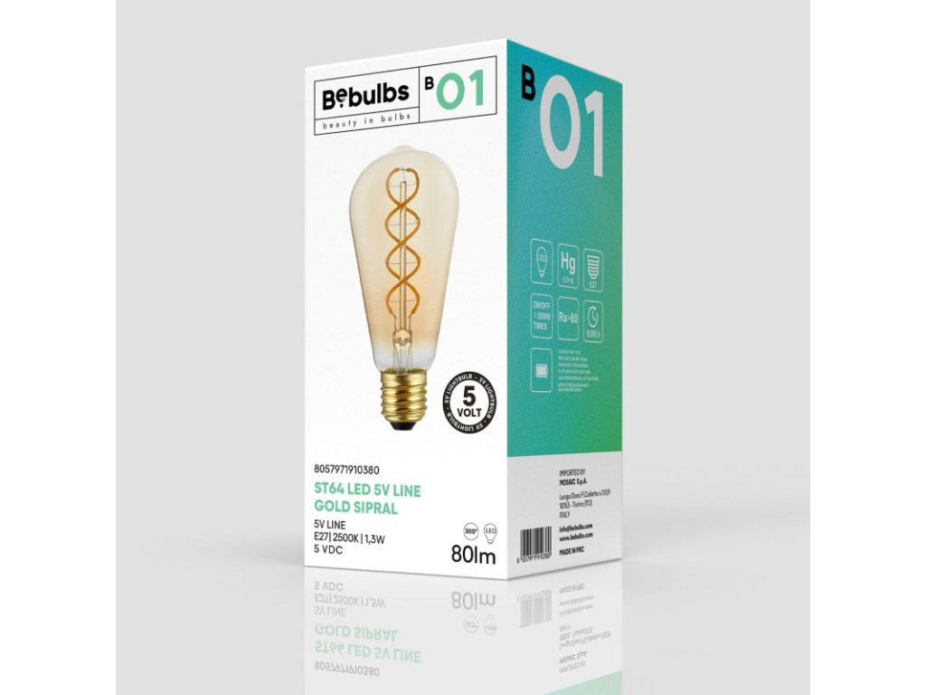 Vintage vzhľad a nadčasový pôvab má žiarovka B01, ktorá je napájaná iba 5 V prúdom. Žiarovka B01 sa môže pochváliť pôsobivou životnosťou (15 000 hodín pri 20 000 cykloch zapnutia/vypnutia) a tvar ky, odkazujúce na doby starých rádií a televízií. Zlatisté sklo vyžaruje mäkké teplé svetlo, pre pohodovú a intímnu atmosféru. Bebulbs, značka, ktorá neustále posúva hranice dizajnu očarujúcich LED žiaroviek vysokej kvality, ponúka moderné spracovanie tradičných žiaroviek.
