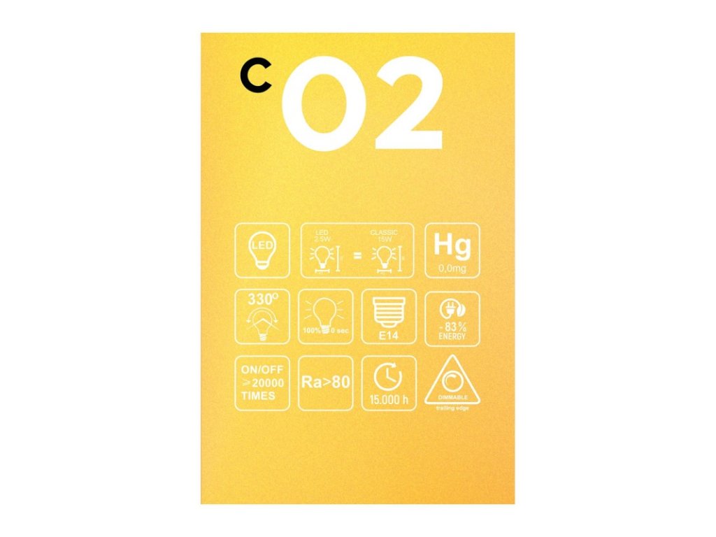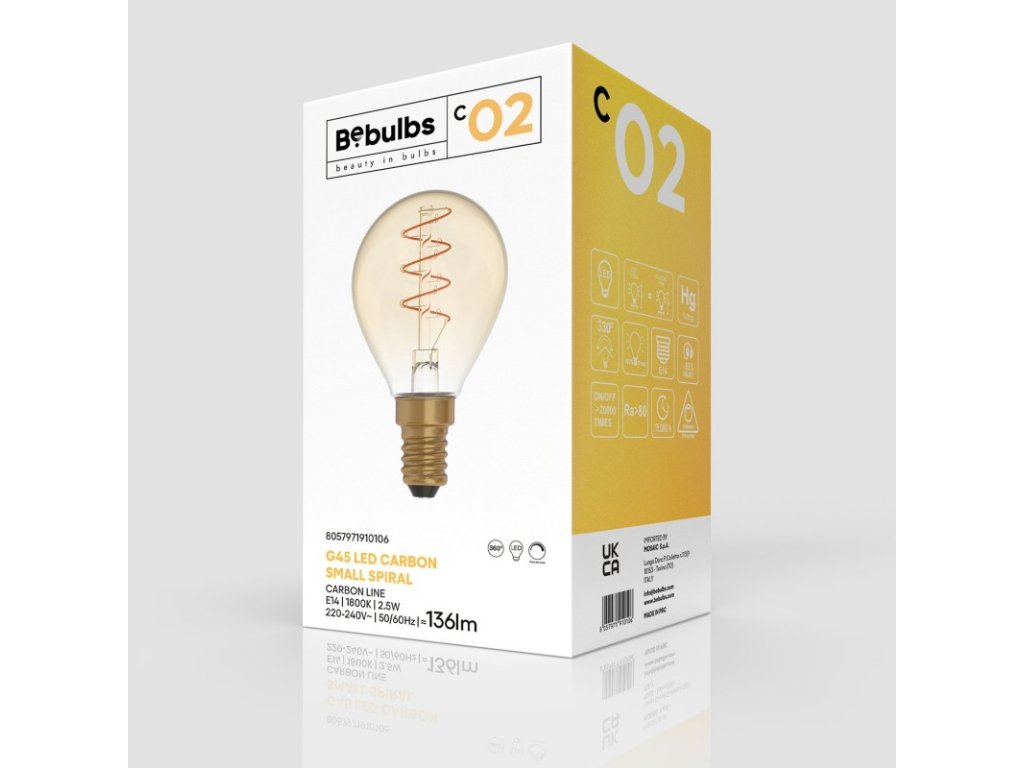 Tvar u a zmenšené rozmery, prichádza C02, špičková žiarovka, pokiaľ ide o svetelné reťaze alebo stolné lampy. Jej patentované vlákno novej generácie – najtenšie na trhu – má charakteristický špirálovitý tvar, veľmi sa tak podobá vláknu tradičných žiaroviek. Stmievateľná žiarovka s veľmi dlhou životnosťou (15 000 hodín pri 20 000 cykloch zapnutia/vypnutia). Bola vyrobená zo skla zlatej farby, ktoré vydáva mäkké, intímne jantárové svetlo; dokonalý doplnok pre príjemnú atmosféru.. Bebulbs, značka, ktorá neustále posúva hranice dizajnu očarujúcich a veľmi kvalitných LED žiaroviek, teraz predstavuje rad Carbon: moderné poňatie tradičných žiaroviek.