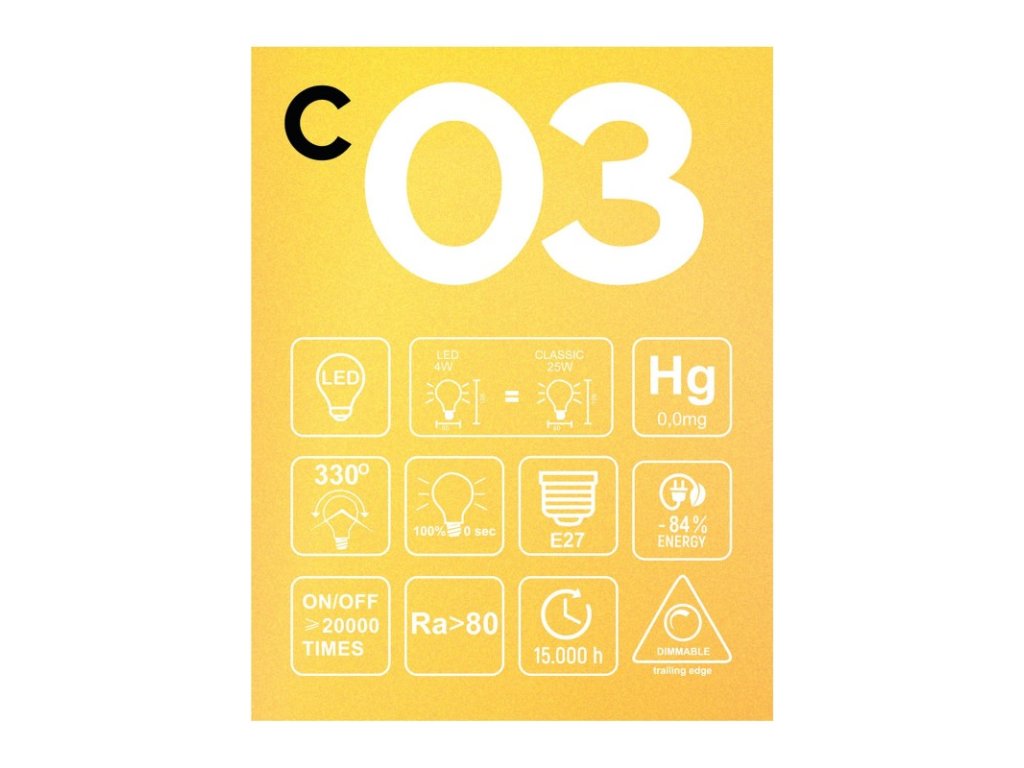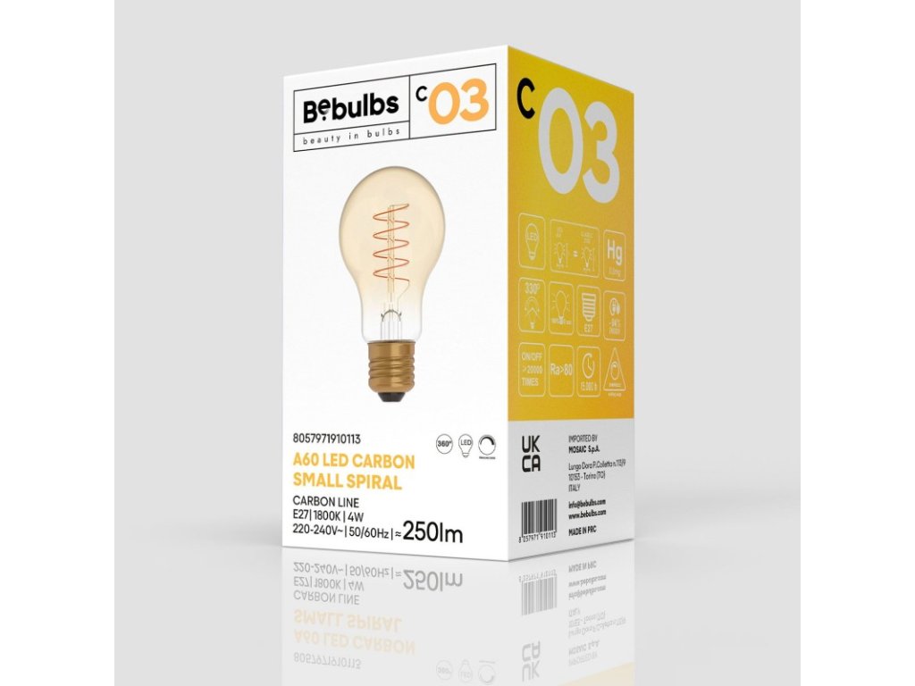 Maximálna účinnosť vo vintage obale, to je naša žiarovka C03 s tradičným tvarom kvapky a exkluzívnym vláknom. Toto patentované vlákno s výrazným špirálovitým tvarom je veľmi podobné vláknu, ktoré sa nachádza v tradičných žiarovkách. Stmievateľná žiarovka s veľmi dlhou životnosťou (15 000 hodín pri 20 000 cykloch zapnutia/vypnutia). Bola vyrobená zo skla zlatej farby, ktoré vydáva mäkké, intímne jantárové svetlo; dokonalý doplnok pre pokojnú, pohodovú atmosféru. Bebulbs, značka, ktorá neustále posúva hranice dizajnu očarujúcich a veľmi kvalitných LED žiaroviek, teraz predstavuje rad Carbon: moderné poňatie tradičných žiaroviek.