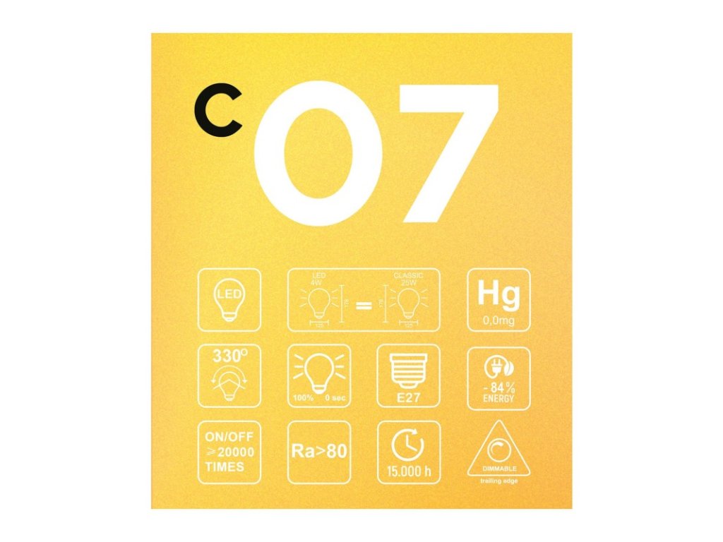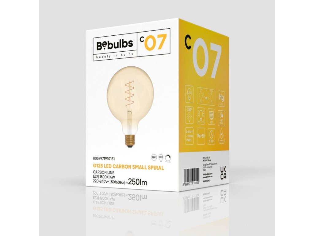 Žiarovka C07 tvaru (glóbusu) s priemerom 125 mm je účinná dizajnová žiarovka, ktorú môžete používať samostatne alebo v rôznych kombináciách. Jej patentované vlákno novej generácie - najtenšie na trhu - má charakteristický špirálovitý tvar, je veľmi podobné ako pri tradičných žiarovkách. Stmievateľná žiarovka s veľmi dlhou životnosťou (15 000 hodín pri 20 000 cykloch zapnutia/vypnutia). Bola vyrobená zo skla zlatej farby, ktoré vydáva mäkké, intímne jantárové svetlo; dokonalý doplnok pre pokojnú, pohodovú atmosféru. Bebulbs, značka, ktorá neustále posúva hranice dizajnu očarujúcich a veľmi kvalitných LED žiaroviek, teraz predstavuje rad Carbon: moderné poňatie tradičných žiaroviek.