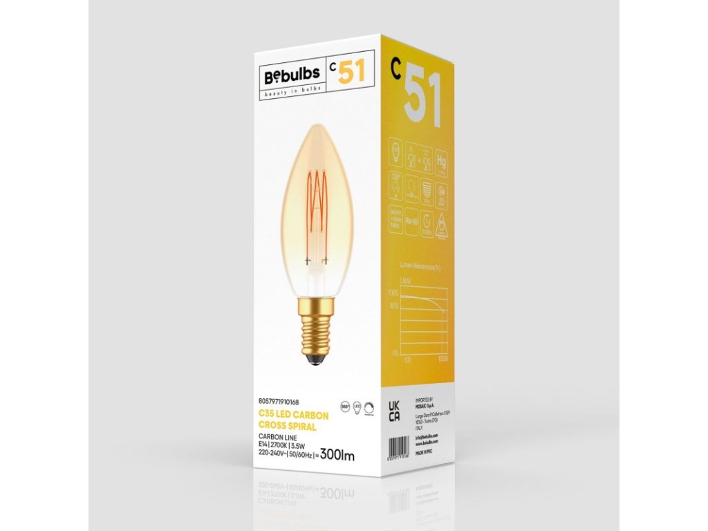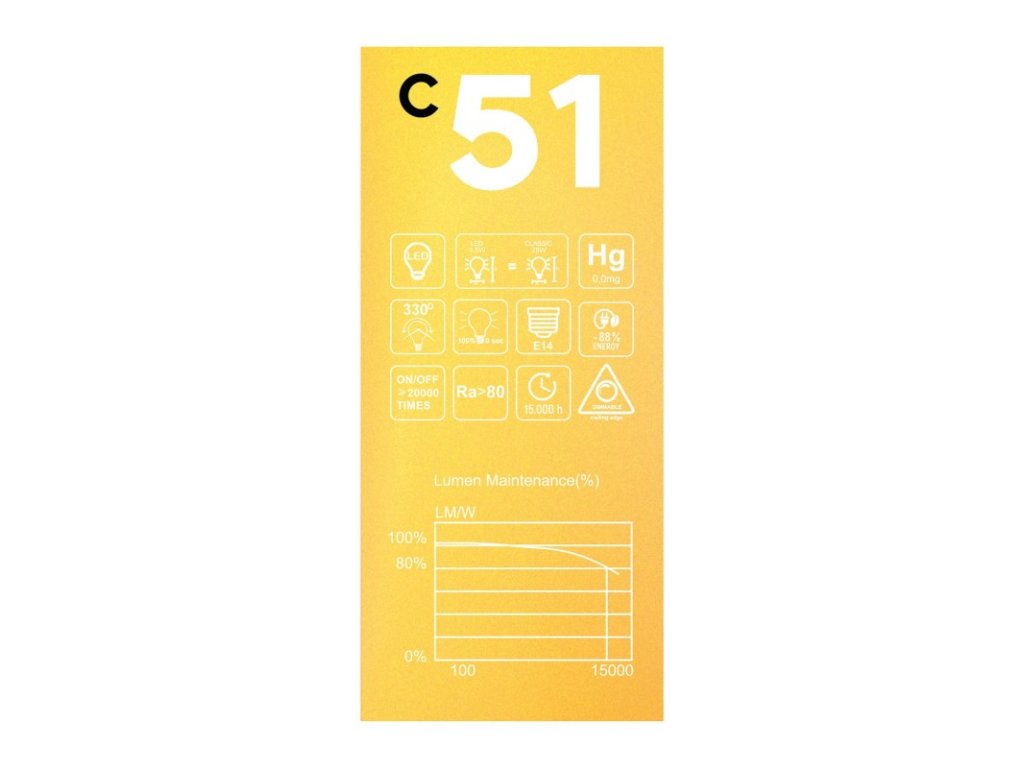 Vďaka svojmu typickému tvaru sviečky je žiarovka C51 ideálna na osvetlenie malých priestorov, ako sú pracovné stoly a nočné stolíky, a dodáva im zábavný retro nádych. Jej vertikálne vlákno – najtenšie na trhu – má výrazný tvar a je podobné tomu, ktoré sa nachádza v tradičných žiarovkách. Stmievateľná žiarovka s veľmi dlhou životnosťou (15 000 hodín pri 20 000 cykloch zapnutia/vypnutia). Vyžaruje teplé, relaxačné svetlo, ktoré dokonale napodobňuje svetlo, aké poznáme zo starých žiaroviek. Farebná teplota 2700 K vytvára útulnú, presvetlenú atmosféru pre jasný rozhľad po vašom okolí. Bebulbs, značka, ktorá neustále posúva hranice dizajnu očarujúcich a veľmi kvalitných LED žiaroviek, teraz predstavuje rad Carbon: moderné poňatie tradičných žiaroviek.