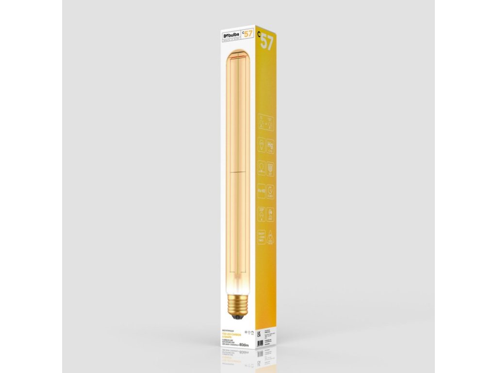 Táto dlhá valcovitá žiarovka s jantárovo sfarbeným sklom má dizajnový švih (a matne pripomína kúzelný prútik!). Teplé, zlatisté svetlo, ktoré skutočne žiari, či už v kombinácii s otvoreným tienidlom alebo aj samostatne bez neho. Vlákno vo vnútri žiarovky, patentované a extrémne tenké, sa pýši modernou technológiou a extrémnou účinnosťou, takže je takmer nemožné ho odlíšiť od toho tradičného. Stmievateľná žiarovka s veľmi dlhou životnosťou (15 000 hodín pri 20 000 cykloch zapnutia/vypnutia). Vyžaruje teplé, relaxačné svetlo, ktoré dokonale napodobňuje svetlo, aké poznáme zo starých žiaroviek. Farebná teplota 2700 K vytvára útulnú, presvetlenú atmosféru pre jasný rozhľad po vašom okolí. Bebulbs, značka, ktorá neustále posúva hranice dizajnu očarujúcich a veľmi kvalitných LED žiaroviek, teraz predstavuje rad Carbon: moderné poňatie tradičných žiaroviek.