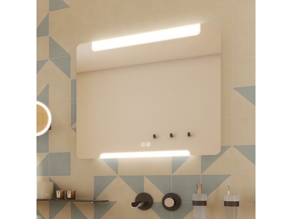 Zrcadlo do koupelny 100x70 cm s osvětlením nahoře a dole, oblé rohy, dotykový spínač je skvělým doplňkem do koupelny. Zrcadla do koupelny NIMCO vynikají kvalitním zpracováním a moderním designem. Svícení za použití akrylátového skla plexiglass. Konstrukce je z hliníkového rámu 32x19 mm, sklo zrcadla o tloušťce 5 mm. Připojení 220-240 V. Zapínání / vypínání / ovládání dotykovým senzorem s pamětí. Možnost nastavení barevné teploty svícení a intenzity svítivosti. Životnost LED diod je až 50 000 hodin. Ochrana IP 44. Součástí zrcadla je kabelová spojka, IP 44. Koupelnové podsvícené LED zrcadlo Životnost diod až 50 000 hodin Příkon 22,5 W Možnost nastavení barevné teploty od 3000 - 6500 K Možnost nastavení intenzity svítivosti Zrcadlo má paměť, pamatuje si poslední nastavené hodnoty První možnost připojení přímo do elektrického obvodu Druhá možnost zapojení zrcadla na klasický kolébkový vypínač v koupelně podobně jako i jiná svítidla 1620 LumenDodatočné parametre