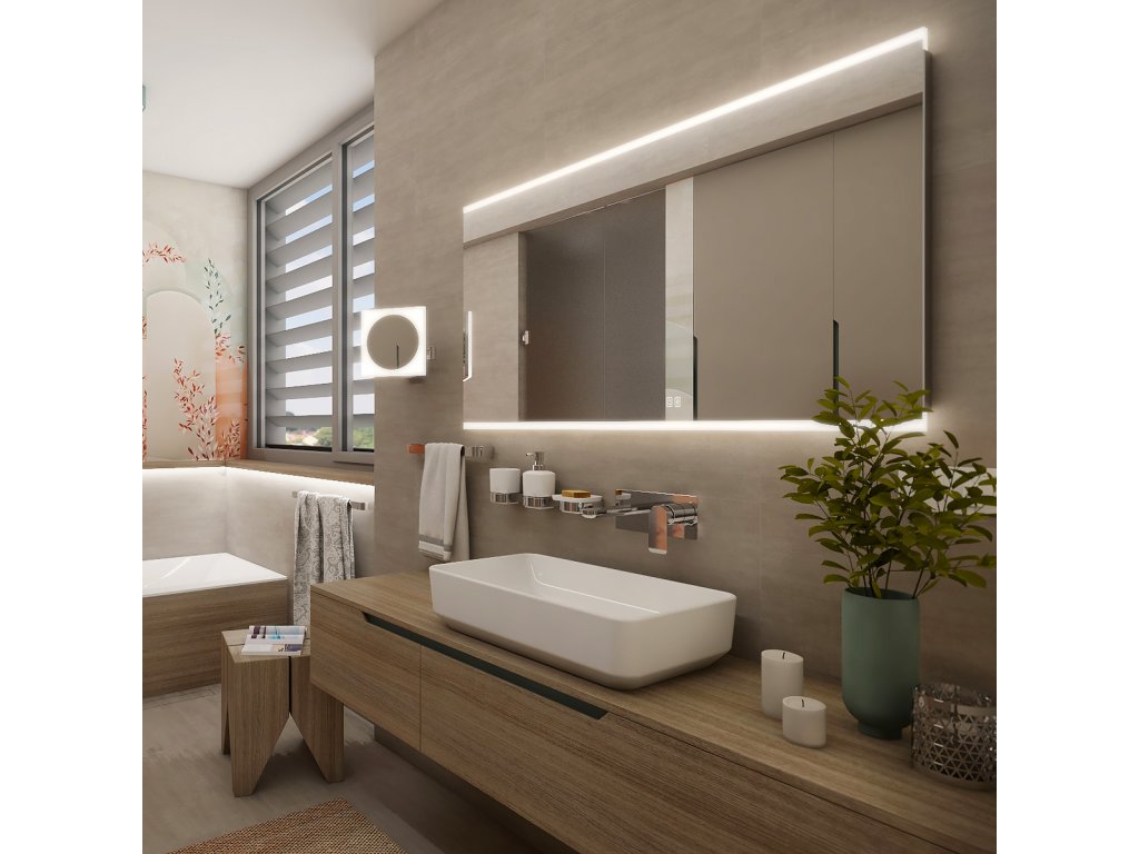 Obdélníkové bezrámové zrcadlo s ostrými rohy a podsvícením ze spodu a shora pro rovnoměrné a stylové osvětlení. Zrcadlo se ovládá dvěma dotykovými podsvícenými senzory, které umožňují změnu barvy podsvícení, nastavení intenzity osvětlení (stmívání) a disponují paměťovou funkcí pro uložení posledního nastavení. Kromě toho lze zrcadlo ovládat i pomocí nástěnného vypínače, což zvyšuje jeho flexibilitu a pohodlí použití. Ke zlepšení kvality podsvícení je použit difuzor z akrylového skla, který zajišťuje rovnoměrný a měkký rozptyl světla. LED diody jsou elegantně integrovány přímo v difuzoru, což zvyšuje intenzitu světla a zaručuje jeho jednotné rozprostření po celé ploše podsvícení. Výsledkem je příjemné a rovnoměrné osvětlení bez viditelných bodových zdrojů. Zrcadlo využívá nejmodernější LED čipy SMD 2835, které jsou známé svou vysokou svítivostí, energetickou úsporností a dlouhou životností. Hustota čipů 96+96/m (192/m), životnost 50 000 hodin. Parametry LED: Survival Factor = 1, Lumen Maintenance Factor 0,99 a Flicker Metric 0,02, pak zajišťují stabilní, bezblikavé a dlouhodobě konzistentní osvětlení. Nosná konstrukce zrcadla je vyrobena z masivního hliníkového rámu o rozměrech 32x19 mm, který zajišťuje vysokou pevnost a stabilitu. Stejně tak je z hliníku vyroben kryt zdroje a všech elektronických součástek. Sklo o tloušťce 5 mm je opatřeno bezpečnostní fólií, která chrání před zraněním v případě rozbití. Zrcadlo navíc disponuje stupněm ochrany proti vlhkosti IP44, což zaručuje spolehlivost i v prostředí s vyšší vlhkostí. Zrcadlo splňuje všechny české normy a je opatřeno českým certifikátem CE, který zaručuje jeho kvalitu a bezpečnost. Nabízí flexibilní možnosti upevnění, a to jak vertikálně, tak horizontálně, a je dodáváno včetně kompletní montážní sady a kabelové spojky s ochranou IP44. Pro zajištění bezpečné přepravy je zrcadlo pečlivě zabaleno a připraveno k expedici prostřednictvím kurýrní služby. Ovládání: Dotykové senzory + možnost ovládání nástěnným vypínačem Nastavení barvy podsvícení: Ano Barva podsvícení: Nastavitelná v rozsahu 3000–6500 K (od teplé po studenou bílou) Funkce stmívání: Plynulé stmívání Paměť nastavení: Ano Konstrukce podsvícení: K rovnoměrnému rozptylu světla zrcadlo disponuje difuzorem z akrylového skla Integrace LED: LED diody jsou integrovány přímo v difuzoru LED čip: Nejmodernější LED čipy SMD 2835 LED pásek - hustota čipů: 192/m (96+96/m) Životnost LED čipů: Až 50 000 hodin Kvalita osvětlení LED: Survival Factor = 1; Lumen maintenance factor = 0,99; Flicker metric = 0,02 Materiál: Zrcadlové sklo, hliník Materiál konstrukce: Rám zrcadla a kryt zdroje jsou vyrobeny z hliníku Tloušťka skla: 5 mm Ochrana při rozbití: Bezpečnostní fólie Stupeň ochrany: IP 44 Certifikace: Český certifikát CE Umístění: Montáž na stěnu Možnost upevnění vertikálně i horizontálně Montážní příslušenství: Součástí balení je montážní sada a kabelová spojka s ochranou IP 44 Obal: Zabalené pro přepravu kurýrní službou Napětí: Vstupní napětí 220-240 V Výstupní napětí 12 V Příkon: 29 W, světelný tok: 2088 lm Rozměr: v: 700 mm š: 37 mm d: 1000 mm Hmotnost: 12,44 kgDodatočné parametre