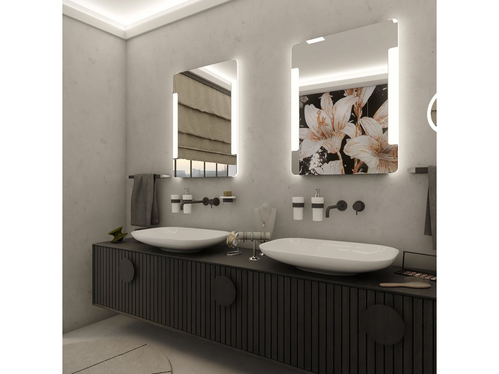Obdélníkové bezrámové zrcadlo s oblými rohy a podsvícením ze stran pro moderní a elegantní vzhled. Zrcadlo bez integrovaného vypínače je určené k připojení a ovládání nástěnným vypínačem. Barva podsvícení zrcadla je pevně nastavena. Ke zlepšení kvality podsvícení je použit difuzor z akrylového skla, který zajišťuje rovnoměrný a měkký rozptyl světla. LED diody jsou elegantně integrovány přímo v difuzoru, což zvyšuje intenzitu světla a zaručuje jeho jednotné rozprostření po celé ploše podsvícení. Výsledkem je příjemné a rovnoměrné osvětlení bez viditelných bodových zdrojů. Zrcadlo využívá nejmodernější LED čipy SMD 2835, které jsou známé svou vysokou svítivostí, energetickou úsporností a dlouhou životností. Hustota čipů 96/m, životnost 50 000 hodin. Parametry LED: Survival Factor = 1, Lumen Maintenance Factor 0,99 a Flicker Metric 0,02, pak zajišťují stabilní, bezblikavé a dlouhodobě konzistentní osvětlení. Nosná konstrukce zrcadla je vyrobena z masivního hliníkového rámu o rozměrech 32x19 mm, který zajišťuje vysokou pevnost a stabilitu. Stejně tak je z hliníku vyroben kryt zdroje a všech elektronických součástek. Sklo o tloušťce 5 mm je opatřeno bezpečnostní fólií, která chrání před zraněním v případě rozbití. Zrcadlo navíc disponuje stupněm ochrany proti vlhkosti IP44, což zaručuje spolehlivost i v prostředí s vyšší vlhkostí. Zrcadlo splňuje všechny české normy a je opatřeno českým certifikátem CE, který zaručuje jeho kvalitu a bezpečnost. Nabízí flexibilní možnosti upevnění, a to jak vertikálně, tak horizontálně, a je dodáváno včetně kompletní montážní sady a kabelové spojky s ochranou IP44. Pro zajištění bezpečné přepravy je zrcadlo pečlivě zabaleno a připraveno k expedici prostřednictvím kurýrní služby. Ovládání: Bez integrovaného spínače Ovládání nástěnným vypínačem Nastavení barvy podsvícení: Barva podsvícení pevně nastavena Barva podsvícení: Barva podsvícení 6500 K (studená bílá) vytváří jasné a přirozené světlo, ideální pro každodenní použití Funkce stmívání: Není instalováno Paměť nastavení: Není instalováno Konstrukce podsvícení: K rovnoměrnému rozptylu světla zrcadlo disponuje difuzorem z akrylového skla Integrace LED: LED diody jsou integrovány přímo v difuzoru LED čip: Nejmodernější LED čipy SMD 2835 LED pásek - hustota čipů: 96/m Životnost LED čipů: Až 50 000 hodin Kvalita osvětlení LED: Survival Factor = 1; Lumen maintenance factor = 0,99; Flicker metric = 0,02 Materiál: Zrcadlové sklo, hliník Materiál konstrukce: Rám zrcadla a kryt zdroje jsou vyrobeny z hliníku Tloušťka skla: 5 mm Ochrana při rozbití: Bezpečnostní fólie Stupeň ochrany: IP 44 Certifikace: Český certifikát CE Umístění: Montáž na stěnu Možnost upevnění vertikálně i horizontálně Montážní příslušenství: Součástí balení je montážní sada a kabelová spojka s ochranou IP 44 Obal: Zabalené pro přepravu kurýrní službou Napětí: Vstupní napětí 220-240 V Výstupní napětí 12 V Příkon: 15 W, světelný tok: 1080 lm Rozměr: v: 800 mm š: 35 mm d: 500 mm Hmotnost: 9,24 kgDodatočné parametre