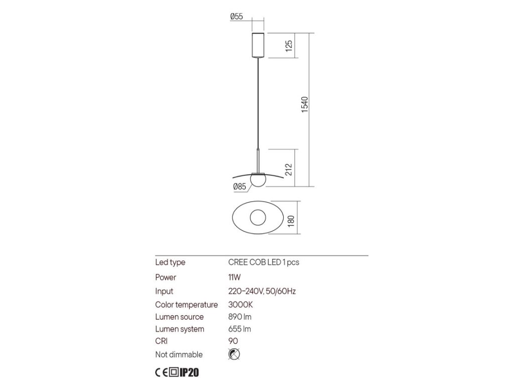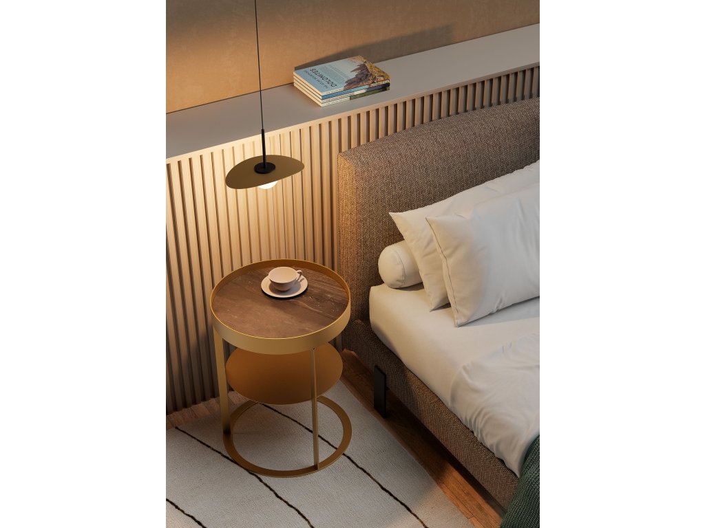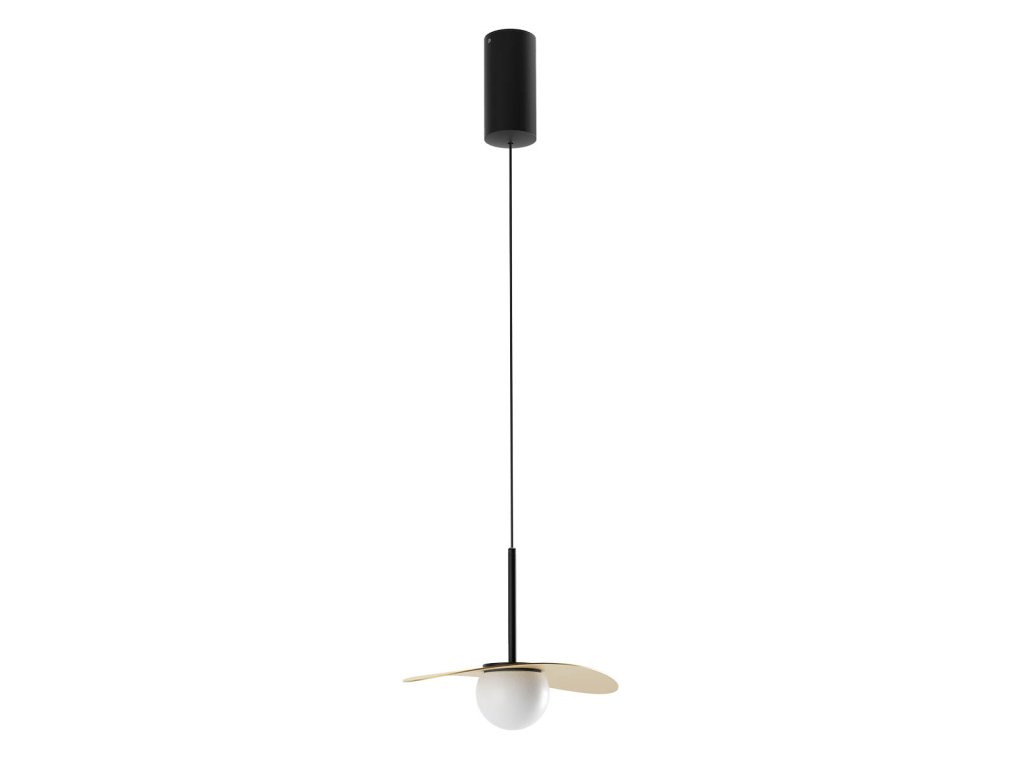 Závesné interiérové svietidlo vybavené COB LED, kovová lakovaná konštrukcia s hliníkovým difúzorom a tienidlom z fúkaného opálového skla.