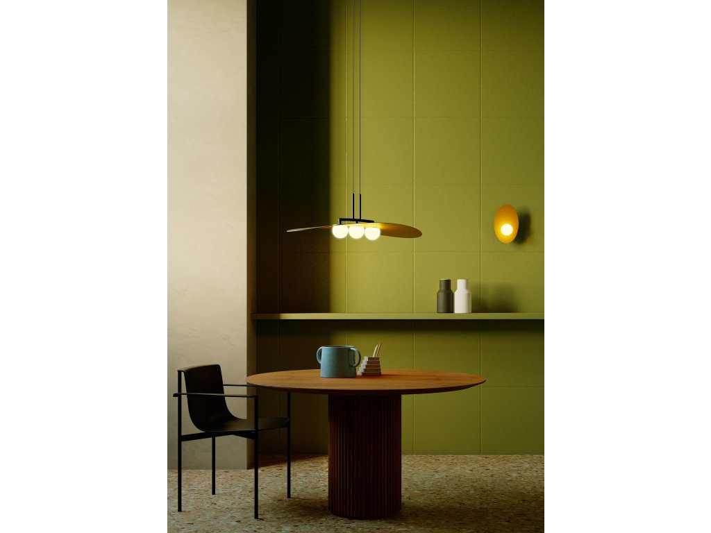 Závesné interiérové svietidlo vybavené COB LED, kovová lakovaná konštrukcia s hliníkovým difúzorom a tienidlom z fúkaného opálového skla.