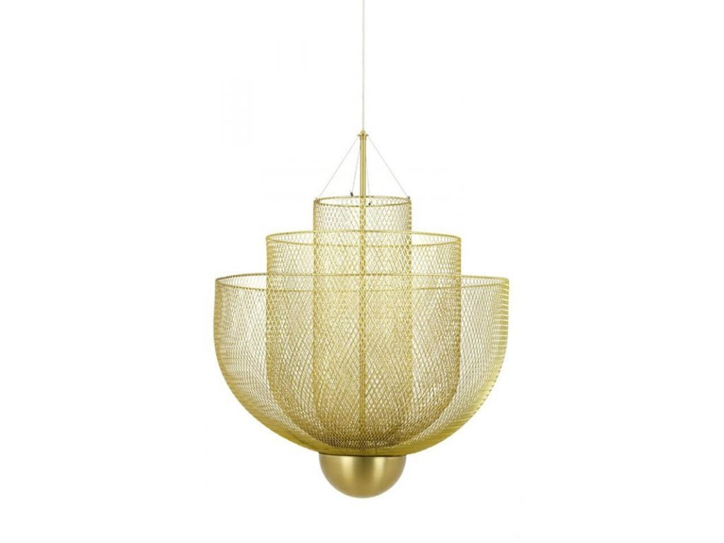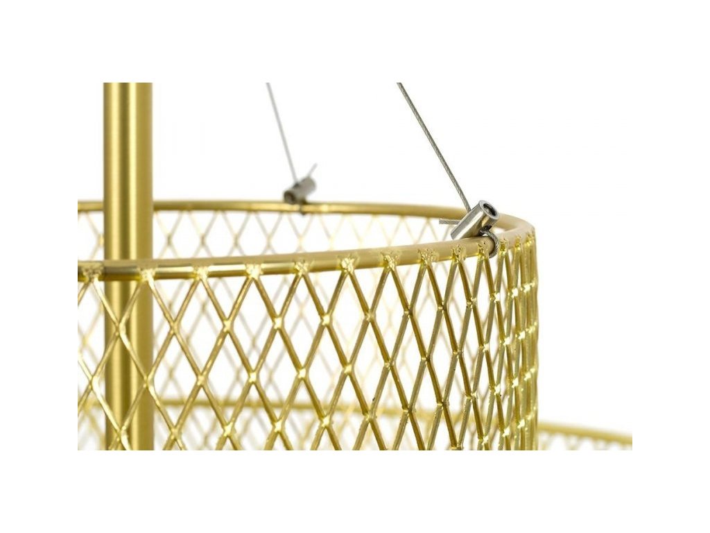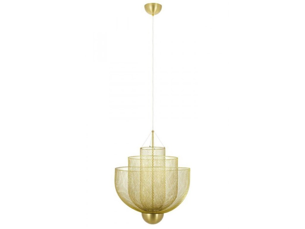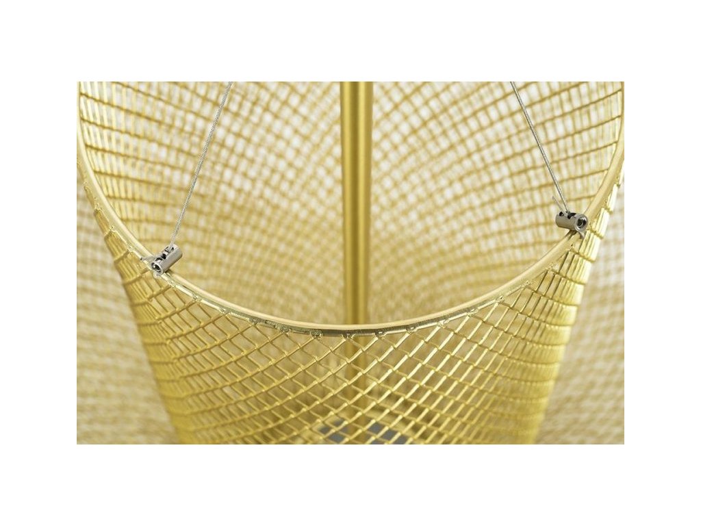 Luxusné závesné svietidlo Illusion L v zlatej farbe. Trojdielne tienidlo je vyrobené z jemnej kovovej sieťoviny a umiestnené na kovovej tyči. v hotelových a reštauračných priestoroch.