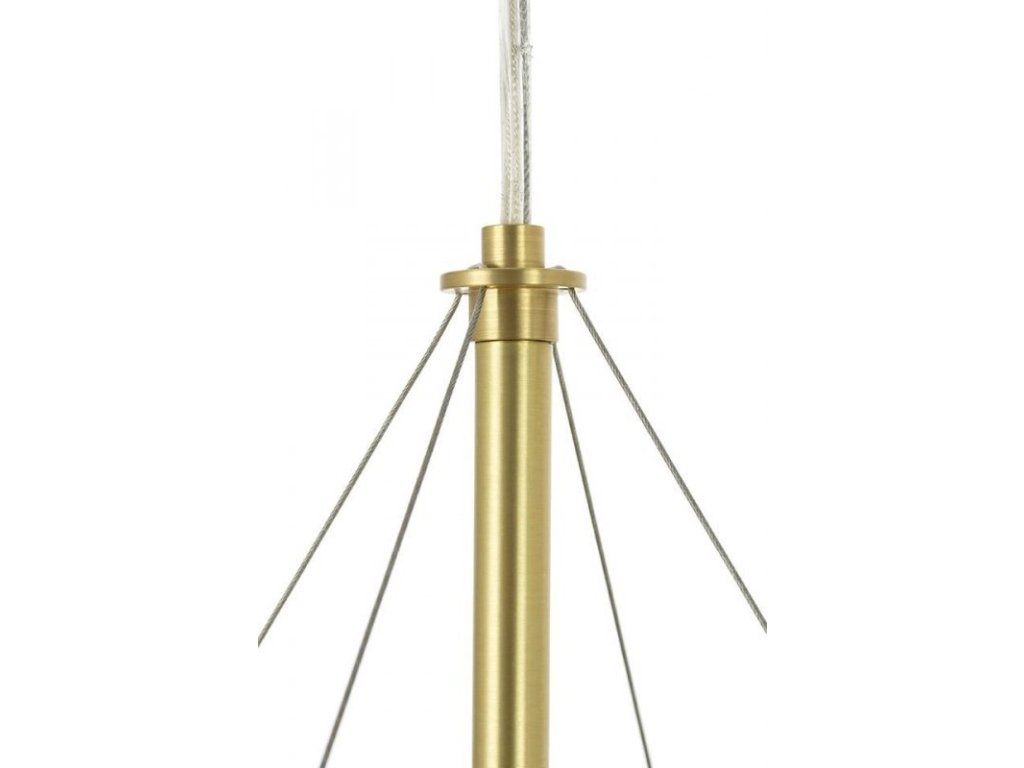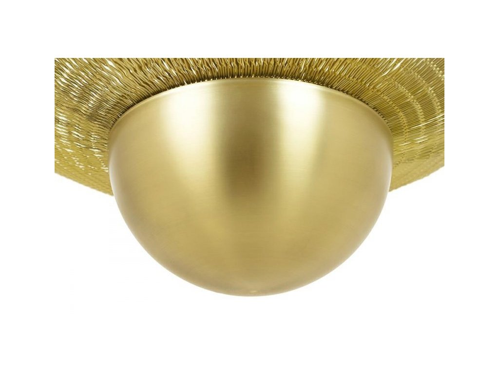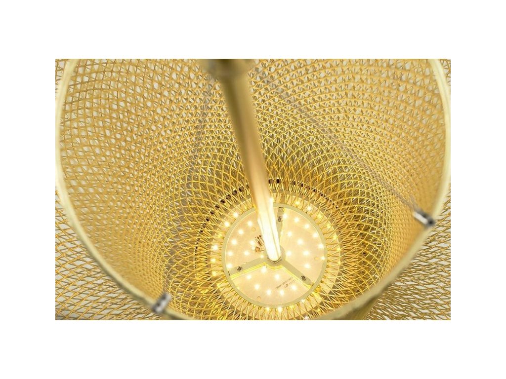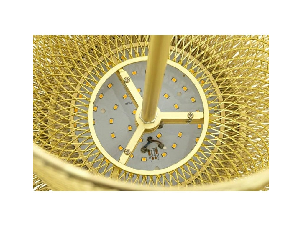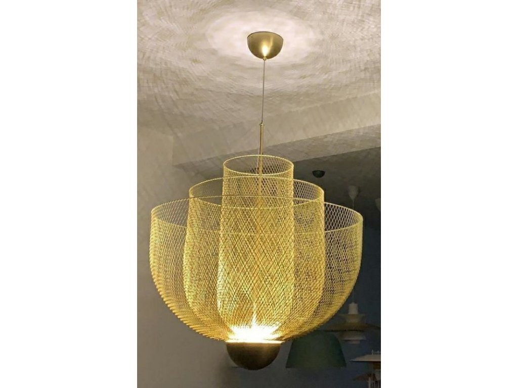 Luxusné závesné svietidlo Illusion L v zlatej farbe. Trojdielne tienidlo je vyrobené z jemnej kovovej sieťoviny a umiestnené na kovovej tyči. v hotelových a reštauračných priestoroch.